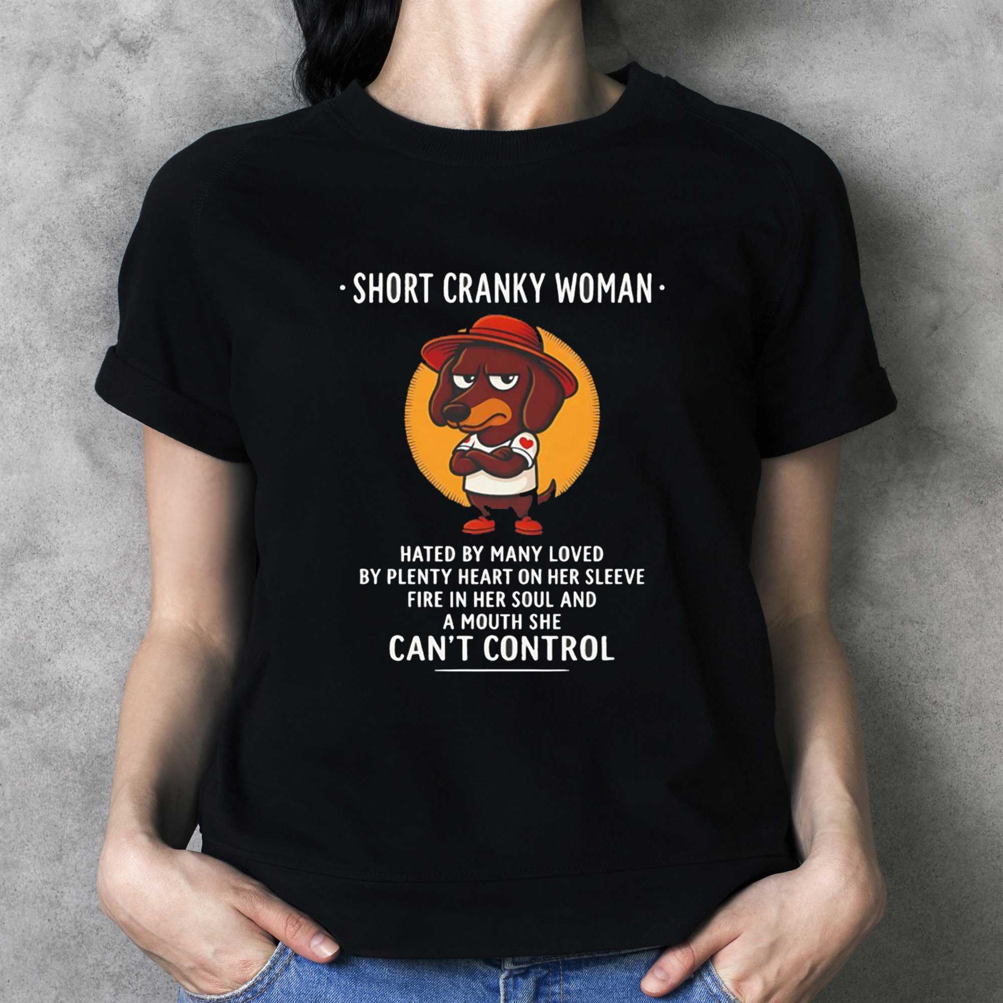 Stand tall and let your clothing reflect your integrity and your voice. Whether you’re heading to a social gathering or just navigating the city, this shirt is a powerful tool for your story. Don’t play it safe—wear your stance and your pride with style. Secure your fearless style and purchase the Dachshund Short Cranky Woman Hated By Many Loved By Plenty Heart On Her Sleeve Fire In Her Soul A Mouth She Can’t Control Tee today!