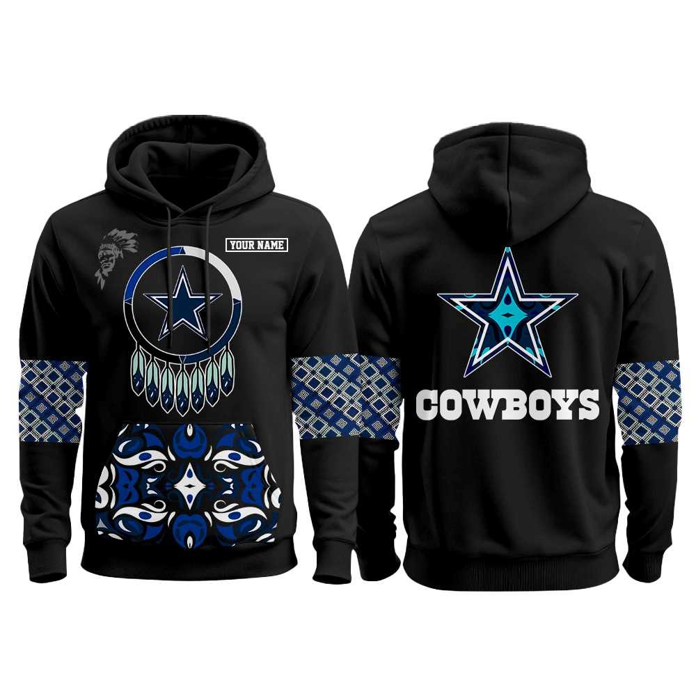 > Ride into glory with our Dallas Cowboys Native American Heritage Month Hoodie, a design that elegantly combines the legendary Cowboys star with traditional Indigenous motifs. The iconic silver and blue of the star are harmoniously integrated with intricate geometric patterns and feather accents, creating a stunning visual narrative. These cultural designs, featured prominently around the star and across the sleeves, evoke the vastness of the plains and the rich heritage of Native American tribes. This hoodie is a powerful fusion, celebrating the enduring legacy of the Cowboys and the deep-rooted traditions of Indigenous peoples. It embodies strength, honor, and a connection to the pioneering spirit. Designed for supreme comfort and lasting quality, it’s perfect for game day, casual wear, or as a cherished addition to any fan’s collection. The unique blend of modern sports iconography and ancient cultural art makes this hoodie a truly distinctive piece, sure to turn heads and spark conversation. Showcase your team pride with a profound appreciation for history.