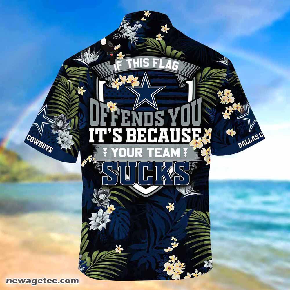 - Our Dallas Cowboys Nfl Summer Beach Hawaiian Shirt This Flag Offends You is made of kate silk-polyester fabric, offers outstanding durability, insulation, and wrinkle resistance. This summer, enhance your wardrobe with a Short Sleeve Hawaiian Beach Shirt that is perfect for casual outings, dates, and sunny beach parties. Its versatile design makes it suitable for a variety of occasions. Made of kate silk-polyester fabric, this shirt is an excellent choice for special events like Christmas, birthdays, celebrations, and housewarming gifts.