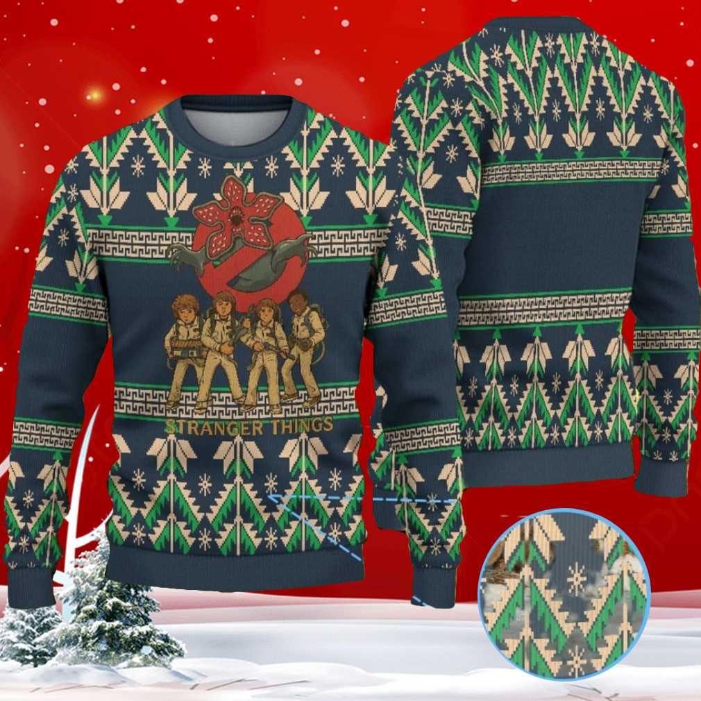 Roar with otherworldly pride this holiday season with the Detroit Lions X Stranger Things Ugly Sweater! This unique design masterfully blends the fierce spirit of the Detroit Lions with the enigmatic allure of the Upside Down. Featuring the iconic Lions logo subtly integrated with the Stranger Things title font, and adorned with captivating red “lightning” effects reminiscent of the show’s ominous energy, this sweater is a true collector’s item. The dark, mottled red background creates a distressed, vintage feel, perfect for those who appreciate a touch of the macabre with their team spirit. Intricate patterns hinting at Hawkins’ mysteries intertwine with classic holiday motifs, making it a conversation starter at any gathering. The sleeves carry subtle team branding, ensuring your allegiance is clear, even when venturing into the unknown. Don’t just watch the game, experience it with a supernatural twist. Unleash your inner fan and conquer the holidays. Get your Detroit Lions X Stranger Things Ugly Sweater today and show everyone where your loyalties lie – in both worlds!. The Dark Navy Geometric Pine Tree Fair Isle Stranger Things Ghostbusters Ugly Christmas Sweater are made from a high quality wool fabric that allows the sweater to breath and regulate your body’s temperature. This active fibre is designed to react to your body’s temperature, keeping you warm in the winter and cool in the summer.