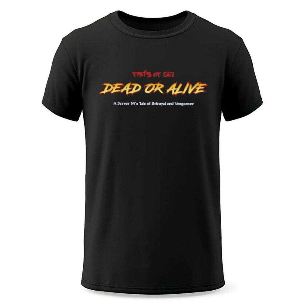 A powerful statement for the fighter with a cause. This t-shirt, for “DEAD OR ALIVE: FISTS OF ‘867,” is a tribute to a group or event dedicated to fighting for victims of betrayal and vengeance. It’s a bold and direct design with a strong message. For the fighter who never gives up. Show your support and your strength with this powerful and meaningful tee..