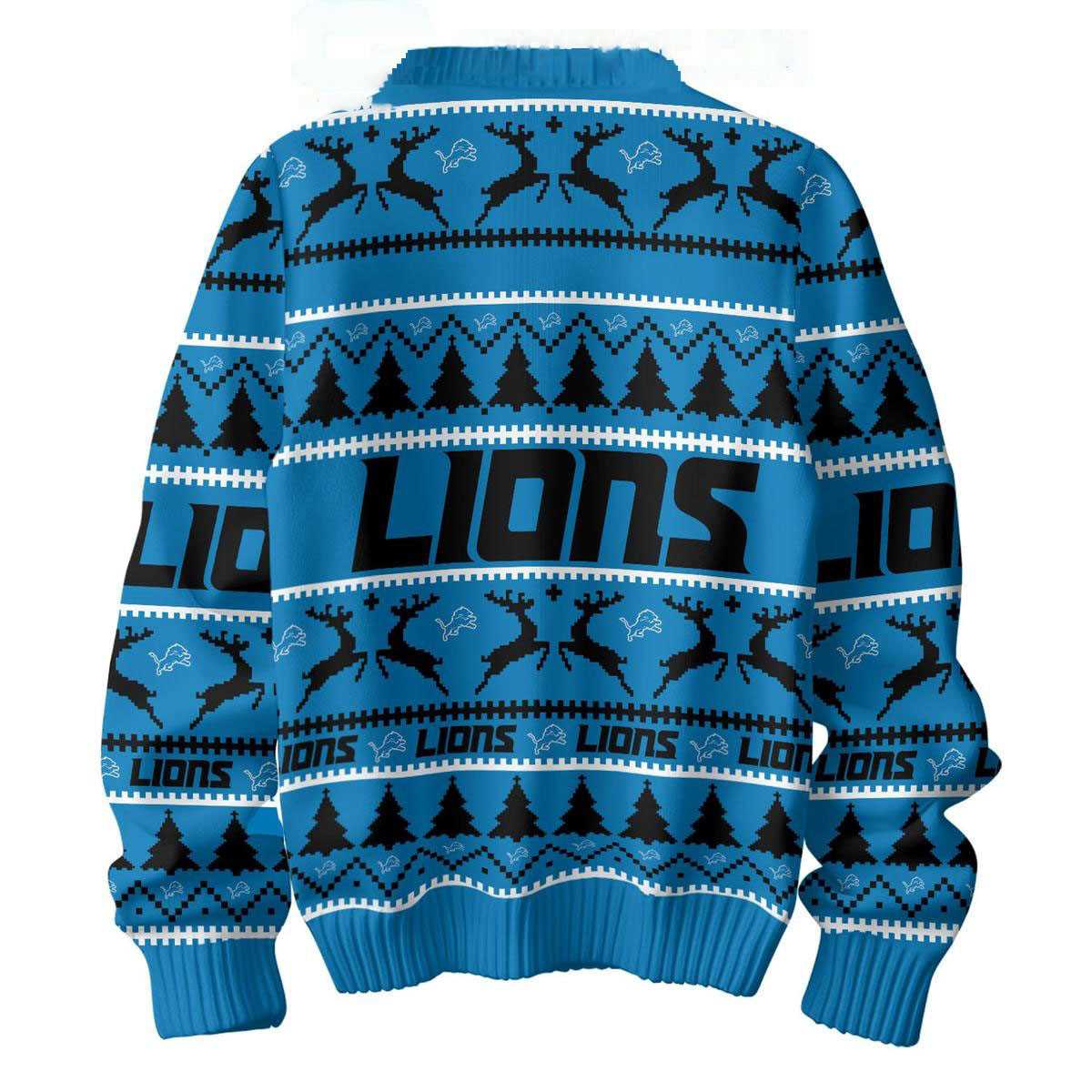The artwork is meticulously detailed, with the leaping Lion logo interspersed among bands of winter snowflakes and geometric shapes. The cool blue tones are soothing yet striking, offering a refreshing break from the standard red and green of the holidays. On the back, the word “LIONS” stretches across the shoulders, backed by a repeating pattern that mimics the look of a traditional hand-knit sweater. It is a design that respects the past while looking forward to a bright future.