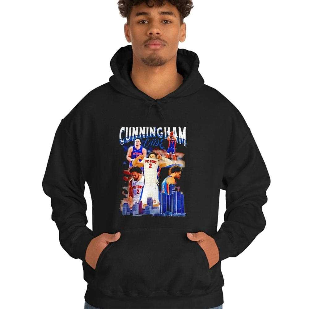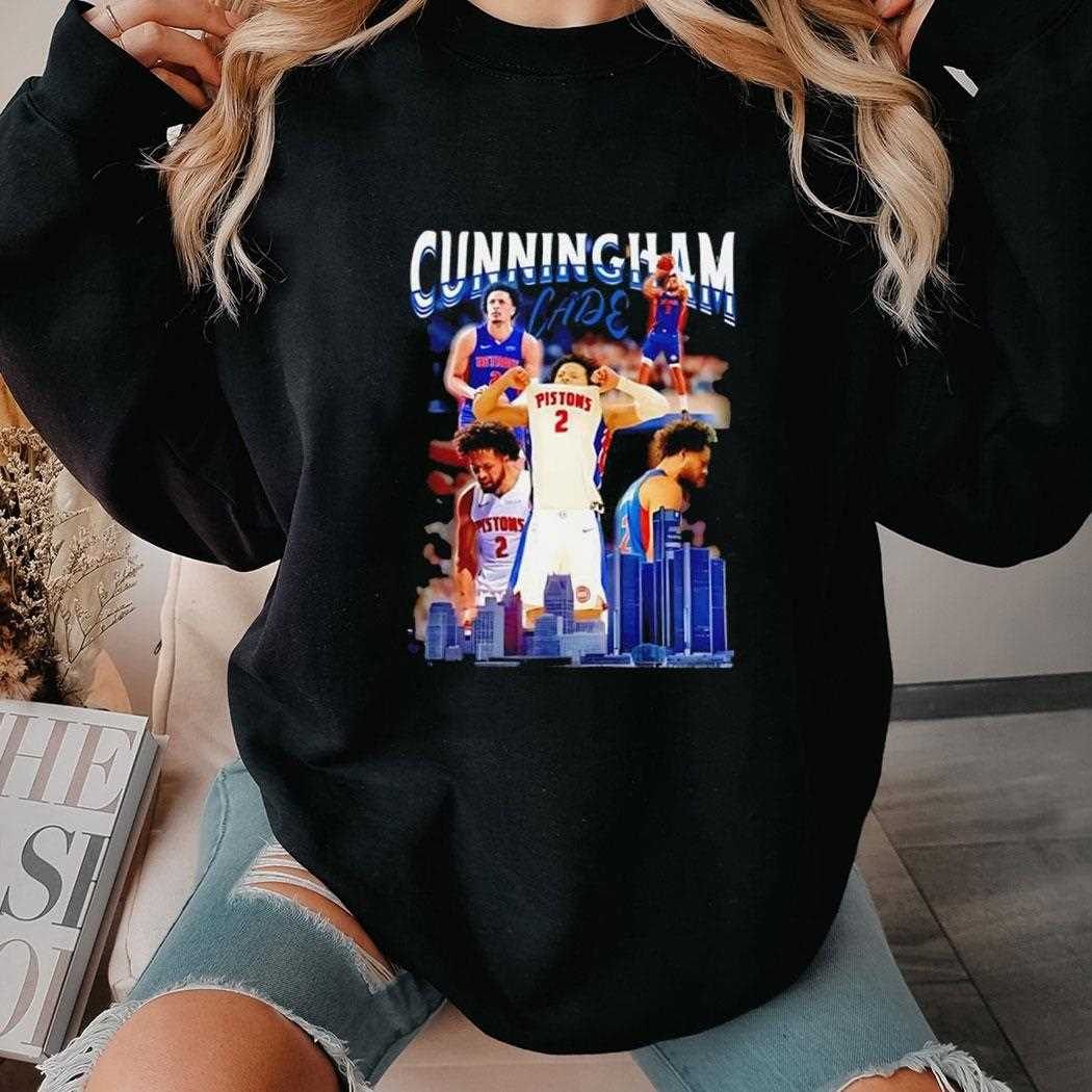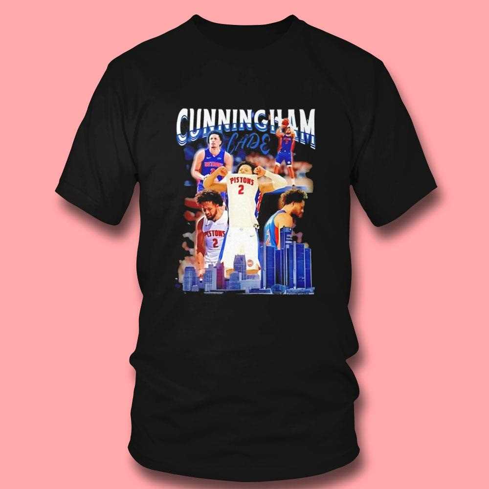 Celebrate the cornerstone of the Detroit Pistons’ future with this Cade Cunningham skyline tee. The design features a high-fidelity graphic of Cunningham in his Pistons jersey, set against a stylized silhouette of the iconic Detroit skyline. The colors are a vibrant mix of “Motor City” blue and red, with glowing accents that give the shirt a modern, digital feel. “Cunningham” is written in a bold, athletic font across the top, marking him as the star of the show. This shirt captures the hope and revitalization of Detroit basketball, making it an essential item for any Pistons fan. The combination of player imagery and city pride makes it more than just a sports shirt; it’s a piece of Detroit’s identity. Represent the future of the D—get your Detroit Pistons Cade Cunningham Graphic Skyline Tee now!. T-shirt !