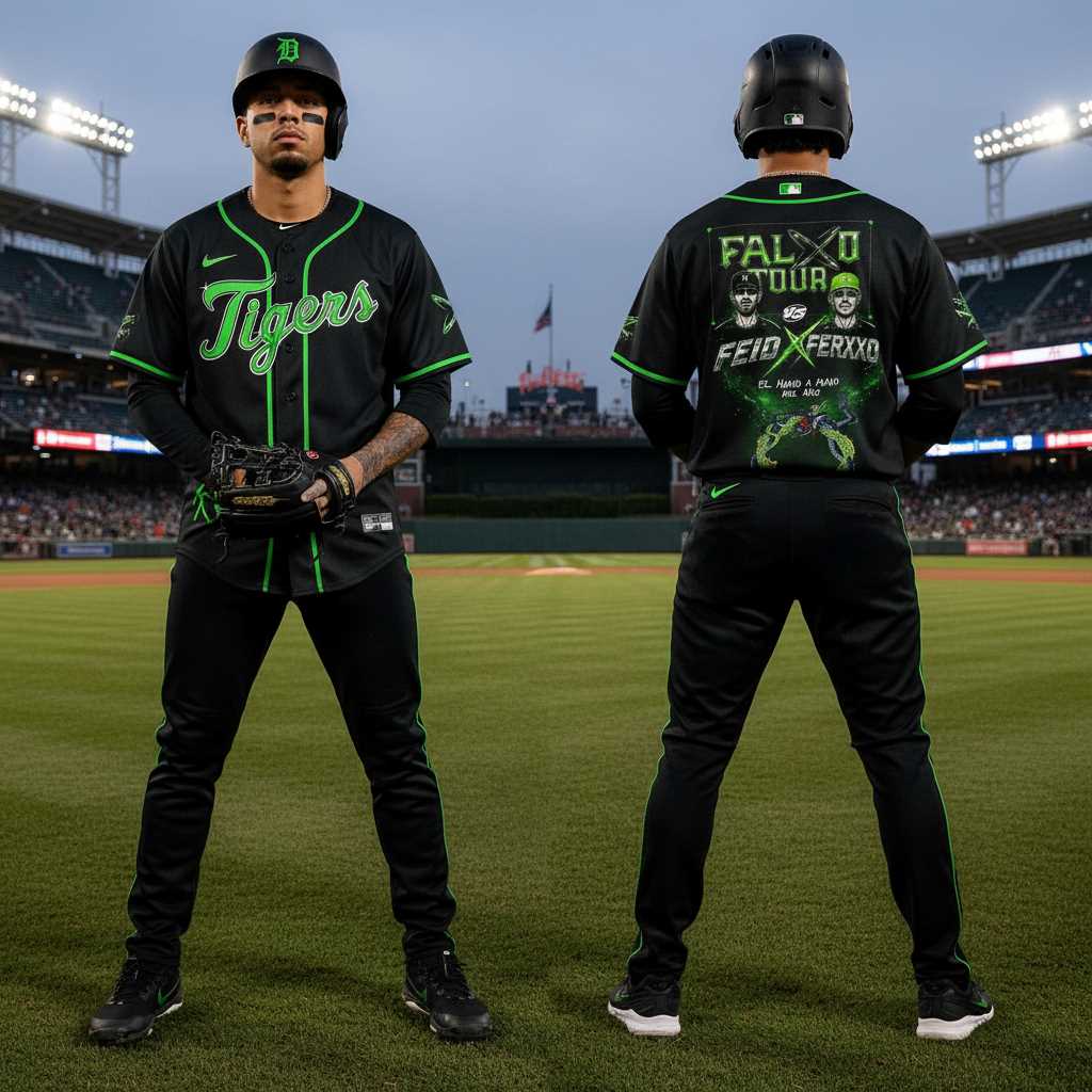 The Detroit Tigers FEID vs FERXXO Falxo Tour 2026 Baseball Jersey hits a grand slam for fans of both music and baseball, blending iconic sports style with concert swagger. This eye-catching black jersey features bold lime green accents, including the classic “Tigers” script logo displayed on the front, outlined in vibrant white. The back is a true showstopper, emblazoned with a vivid graphic featuring “FALXO TOUR” at the top, followed by stylized images of Feid and Ferxxo above “FEID X FERXXO”. Below this, the playful phrase “EL NIÑO A MANO DEL AÑO” sits above a dynamic green monster-like character wielding a baseball bat, all rendered in electric green. This design brilliantly fuses the Detroit Tigers’ heritage with the energetic, playful vibe of the “Falxo Tour”, creating a unique, humorous, and instantly recognizable crossover.