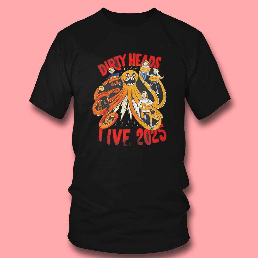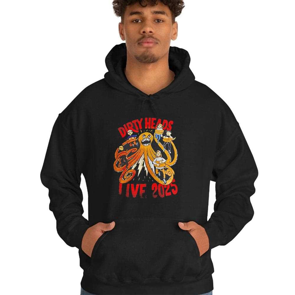 Get ready to rock out with this official-style tour merch for the Dirty Heads. The design is a psychedelic trip, featuring a massive, orange octopus or kraken intertwined with a stylized skull that has a smiley face on its forehead. The creature’s tentacles wrap around the text “DIRTY HEADS” and “LIVE 2025,” creating a cohesive and fluid image that screams reggae-rock energy.