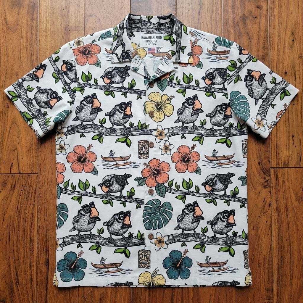 The Disguise in the skies Hawaiin Shirt perfectly captures the playful spirit of this unique design! Prepare for smiles with a vibrant, off-white background adorned with a whimsical array of owl-like creatures attempting comical disguises. These charming grey and brown feathered friends are intricately patterned across horizontal brown tree branches, interspersed with lush green monstera leaves and an explosion of colorful hibiscus and plumeria flowers in peach, yellow, teal, and pink hues. Look closely and you’ll spot one bird hilariously navigating a small brown canoe, another sporting a tiny hat, and a standout character holding a brown sign proudly proclaiming “UFO SIGHTING” – a witty nod to their attempts at blending in, adding a layer of clever humor to this tropical scene.