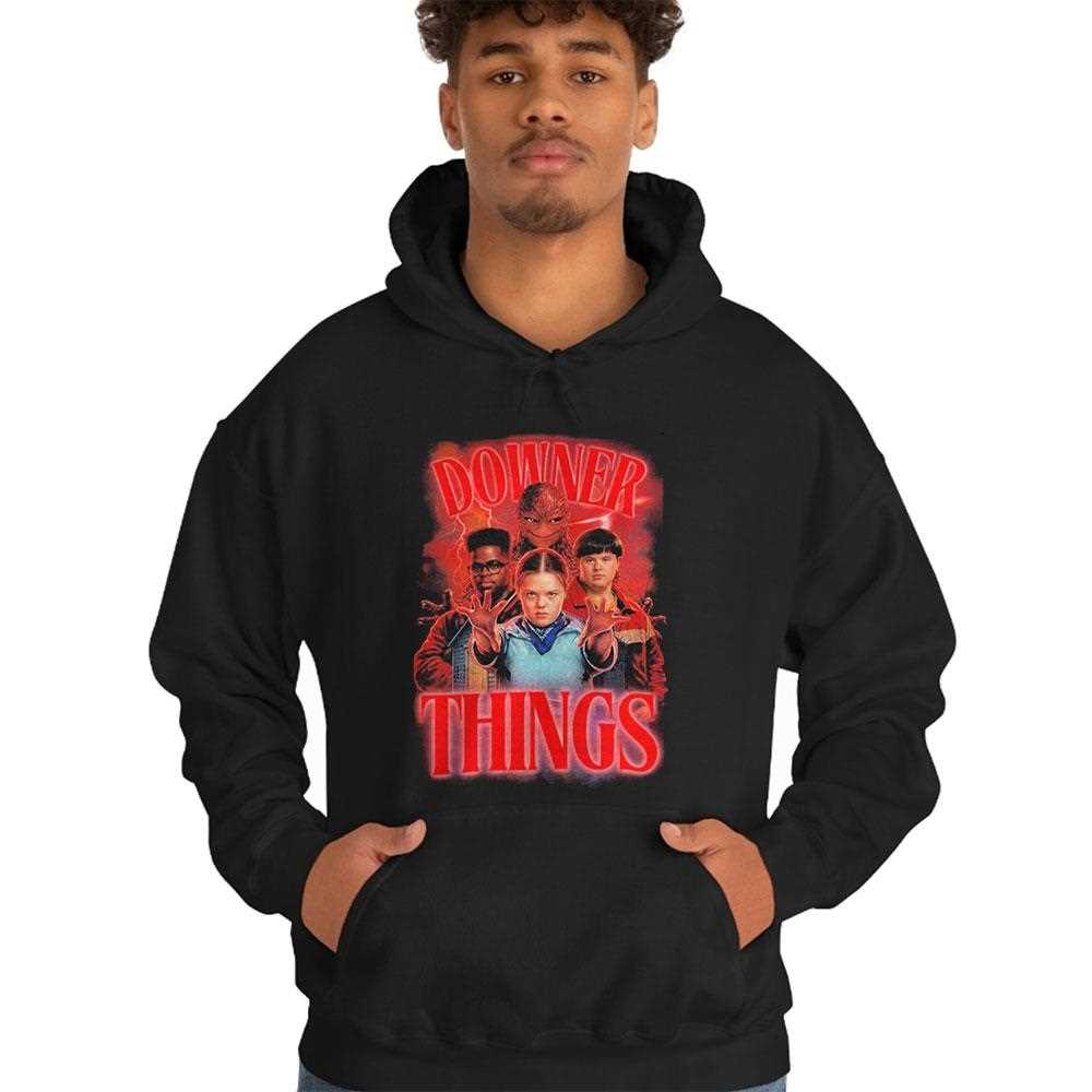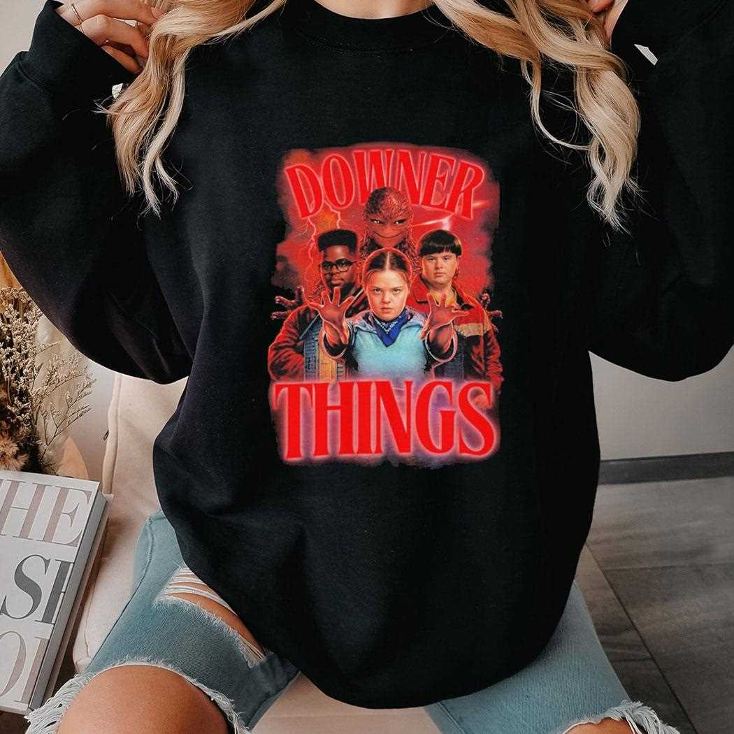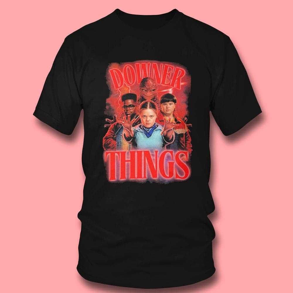 Put a moody, artistic twist on your fandom with this creative “Downer Things” parody. Inspired by the iconic aesthetic of Stranger Things, this design replaces the classic logo with a stylized, neon-red “DOWNER THINGS” font, set against an atmospheric background of the show’s main party looking particularly somber. It’s a perfect blend of sci-fi nostalgia and modern “sad boy/girl” aesthetic, making it a unique standout in any collection of show merchandise. The high-contrast red and black color scheme creates a visually arresting look that demands attention. Printed on a soft-touch, high-grade cotton base, this tee provides a comfortable and breathable fit for your next binge-watching session or casual hangout. The print is engineered with fade-resistant technology, ensuring the spooky vibes stay vivid for years to come. Show everyone you’re a fan who appreciates the darker, more emotional side of Hawkins. Enter the Upside Down with a new perspective—order your Downer Things Stranger Things Tee now!. T-shirt !