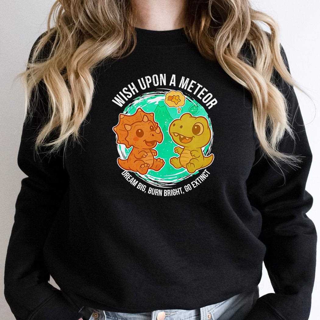 A surprisingly poignant and adorable t-shirt about the end of the world. This cute design features two dinosaur friends watching a meteor shower, with the bittersweet advice, “WISH UPON A METEOR, DREAM BIG, BURN BRIGHT, GO EXTINCT.” This shirt is dino-mite! And a little sad. The perfect blend of cute and dark humor for anyone who loves dinosaurs. Get yours before it’s too late!.
