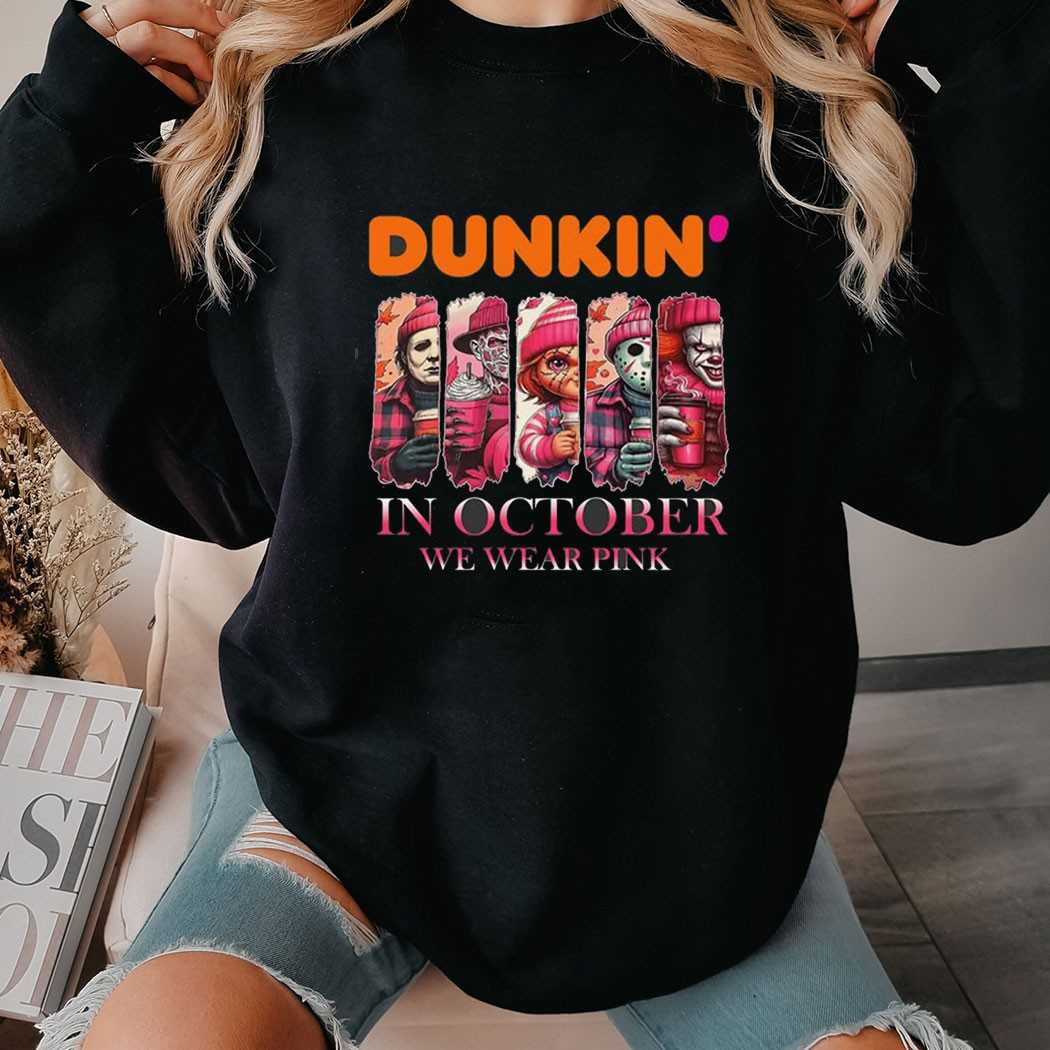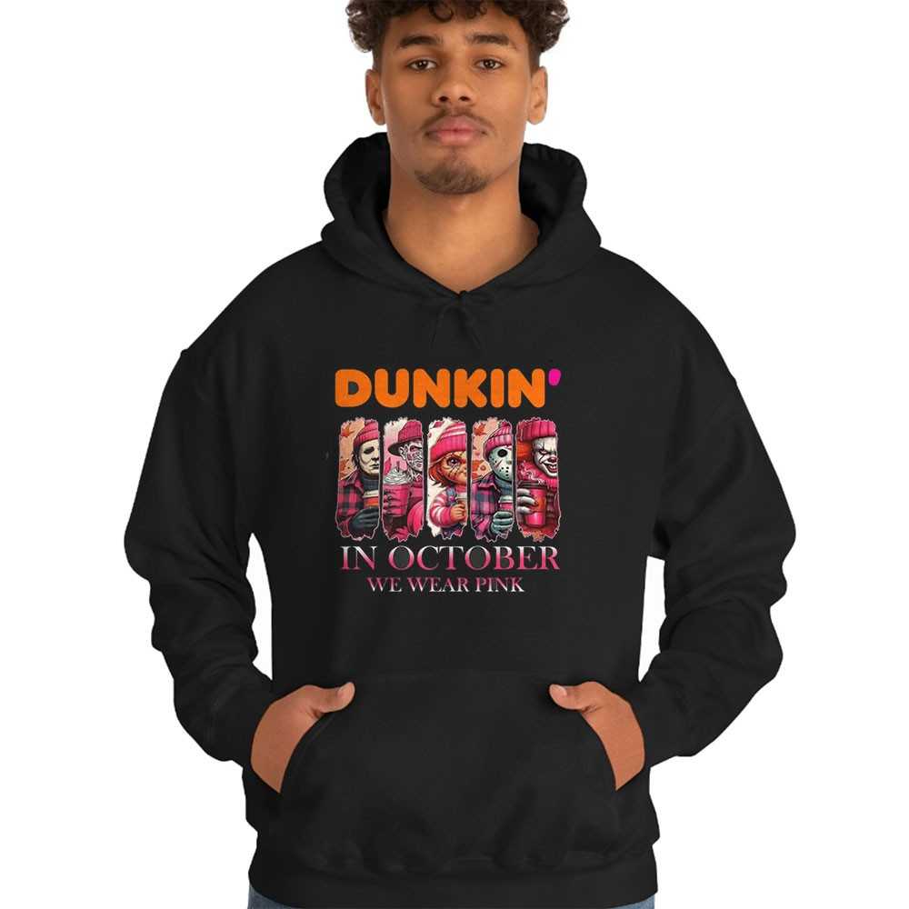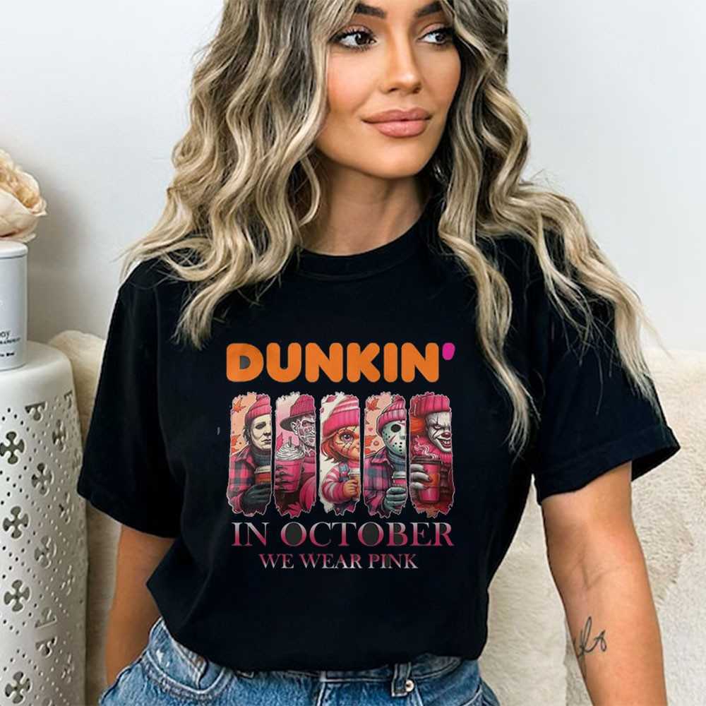 Fuel your frights with a dose of pink in our “Dunkin’ Horror Characters In October We Wear Pink Tee.” This delightfully eerie design features a playful twist, showcasing iconic horror characters enjoying a donut or lurking within a Dunkin’ Donuts-inspired setting, all while supporting breast cancer awareness with the “In October We Wear Pink” message. The graphic cleverly blends classic frights with a touch of fast-food fun and a meaningful cause. Printed on a comfortable, high-quality tee, it’s perfect for horror fans with a sense of humor and a big heart. This shirt is a conversation starter, perfect for Halloween parties or charitable events. Spooky coffee run! Support a great cause with a ghoulish grin. Grab your Dunkin’ Horror Characters In October We Wear Pink Tee and wear your heart on your sleeve!. T-shirt !