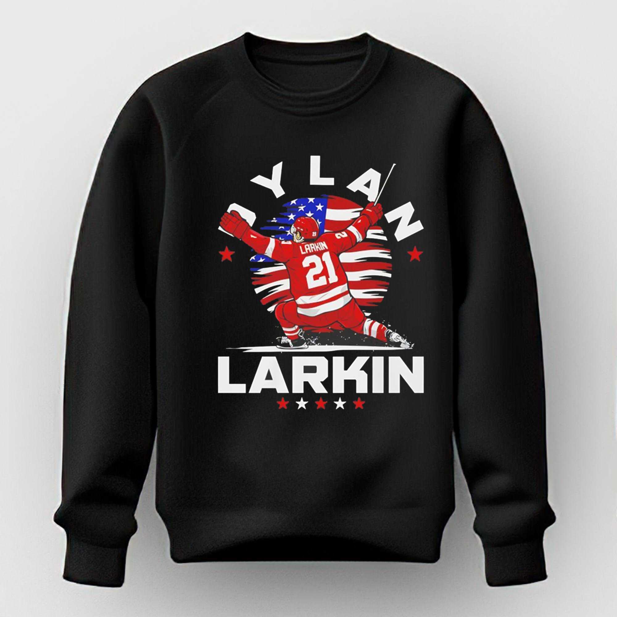Celebrate the heart and soul of Hockeytown with the high-octane Dylan Larkin Detroit Usa Flag Celebration Tee. This design is a powerful tribute to the Red Wings’ captain, featuring a stunning photographic graphic of Larkin in action, set against a patriotic backdrop of the American flag. It captures the energy, the skill, and the collective roar of a fan base that lives for the sound of the siren at Little Caesars Arena. The use of traditional red, white, and blue on a deep black background creates a look that is both professional and intensely athletic, mirroring the intensity of a game-winning goal.
