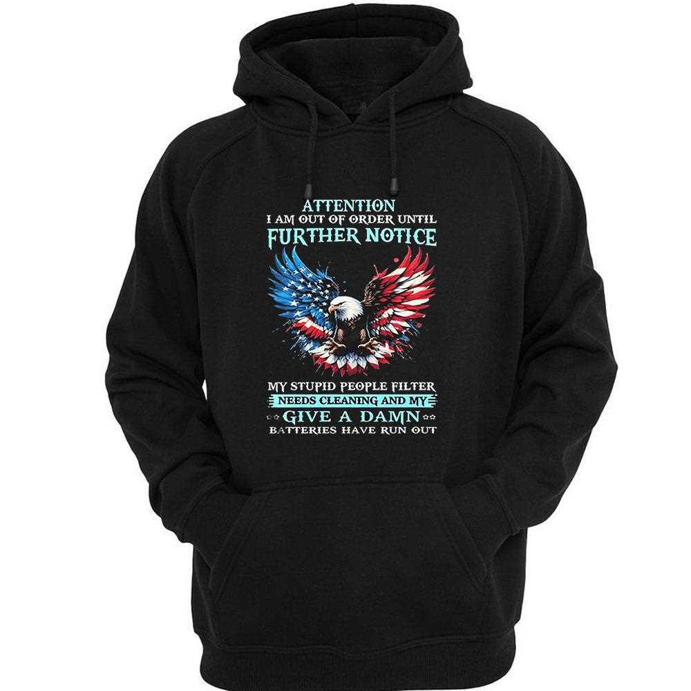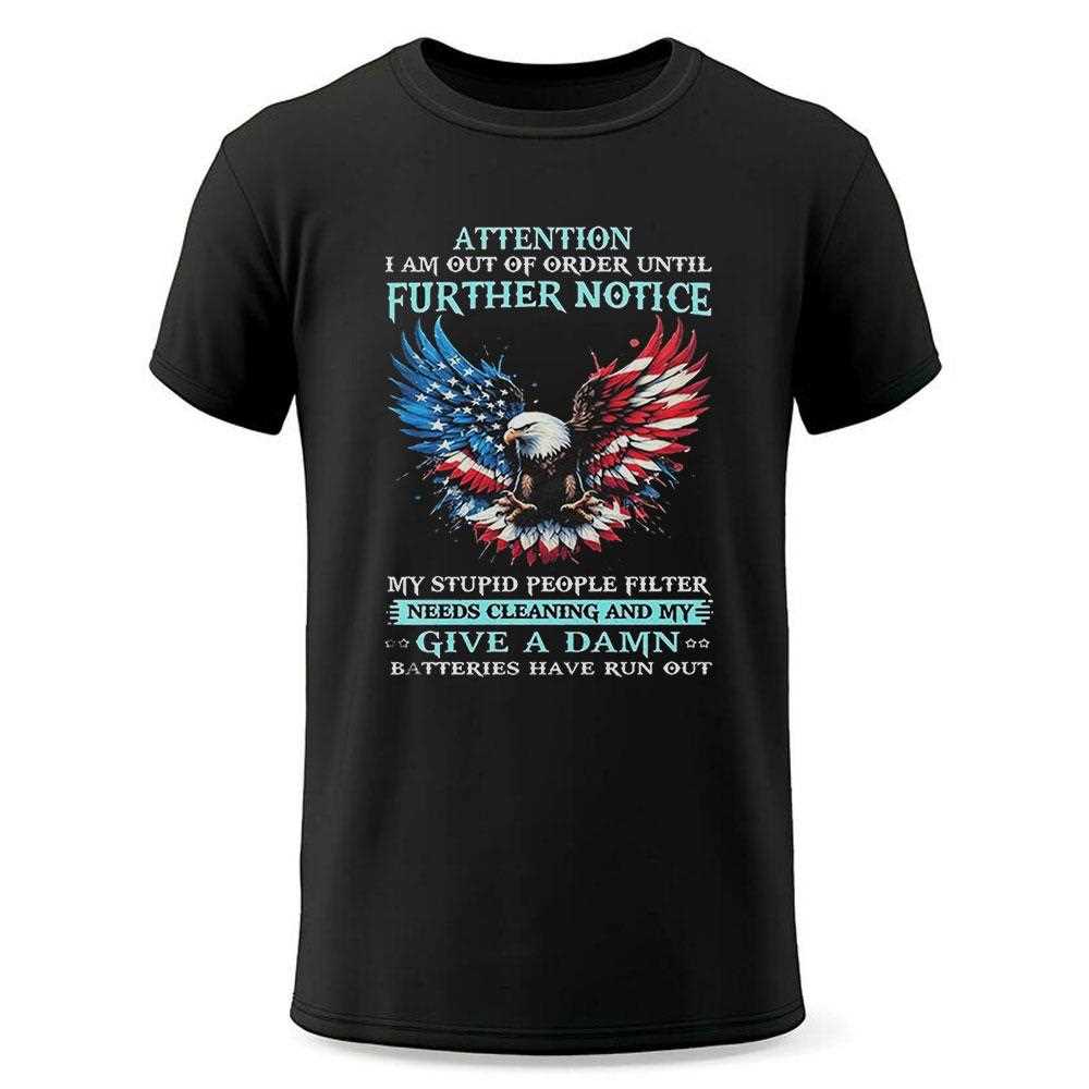 .Introducing the “Eagle Attention I Am Out Of Order Until Further Notice” shirt—a statement piece that combines humor and style in one eye-catching design. This shirt is more than just clothing; it’s a bold declaration that resonates with anyone who has ever needed a break from the chaos of everyday life.