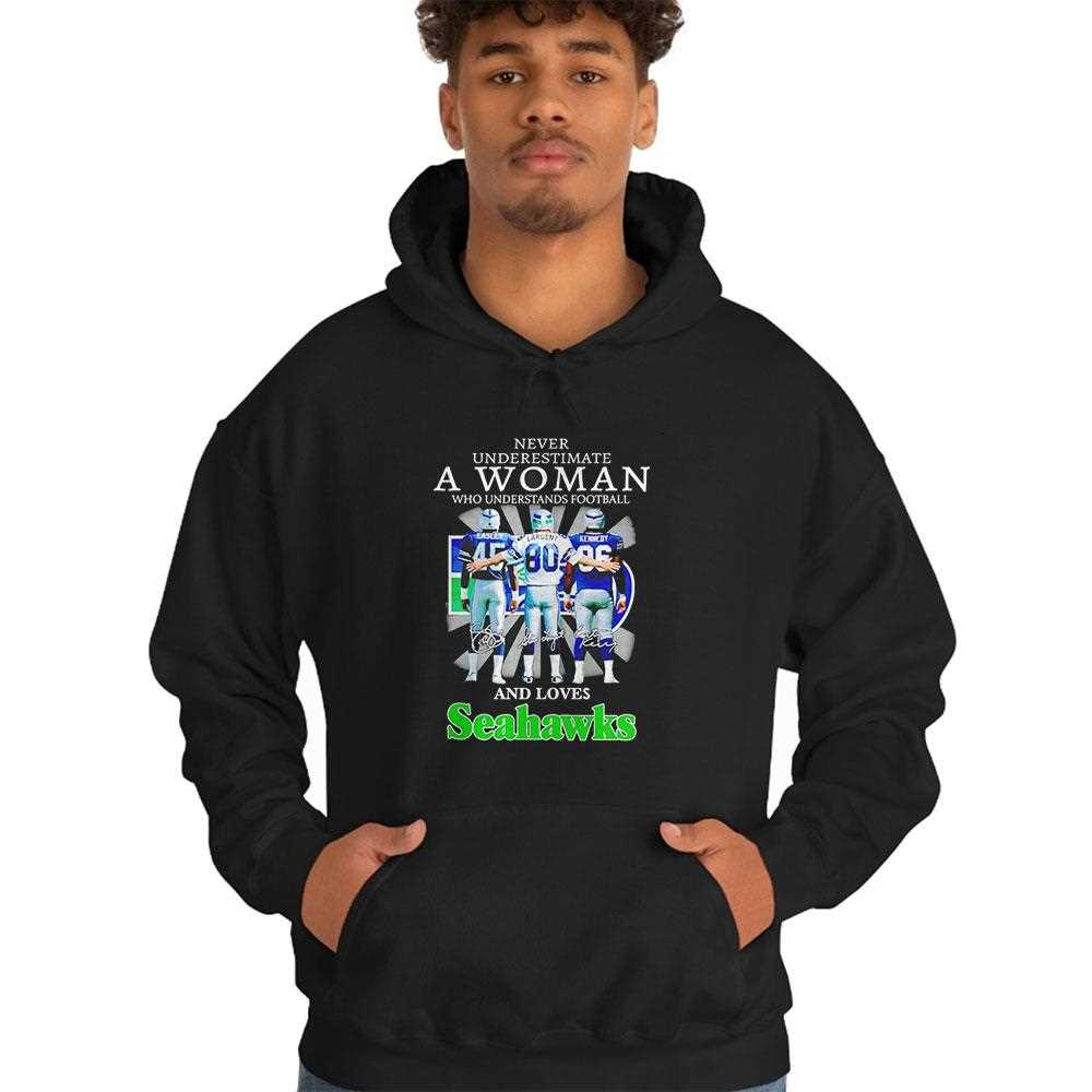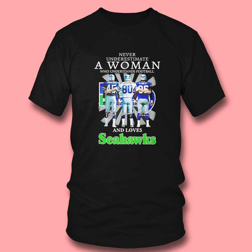 Proclaim your ultimate loyalty and your deep knowledge of the game with this Seattle Seahawks legends tee. Featuring the names of three absolute titans—Kenny Easley, Steve Largent, and Cortez Kennedy—this design is a sophisticated tribute to the emerald and silver heritage. The central graphic focuses on the empowering message “Never Underestimate A Woman Who Understands Football,” framed by the legendary numbers of the Seahawks Ring of Honor. The use of vibrant navy, neon green, and silver creates a professional and high-energy look that perfectly represents the 12th Man spirit. Crafted from a premium, soft-touch ringspun cotton, this shirt offers a flattering, feminine fit and all-day comfort for game days at Lumen Field or casual wear. The high-resolution print ensures the intricate details of the player names and the team logos stay sharp. It’s the ultimate statement piece for the female fans who have seen the grit, the catches, and the sacks that defined a generation. Show everyone that your love for the Hawks is matched only by your football IQ. Honor the legends and show off your game knowledge—purchase the Easley Largent And Kennedy Never Underestimate A Woman Who Understands Football And Loves Seattle Seahawks Tee now!. T-shirt !