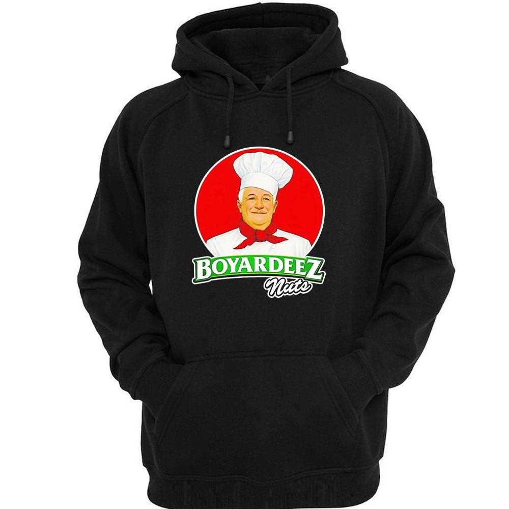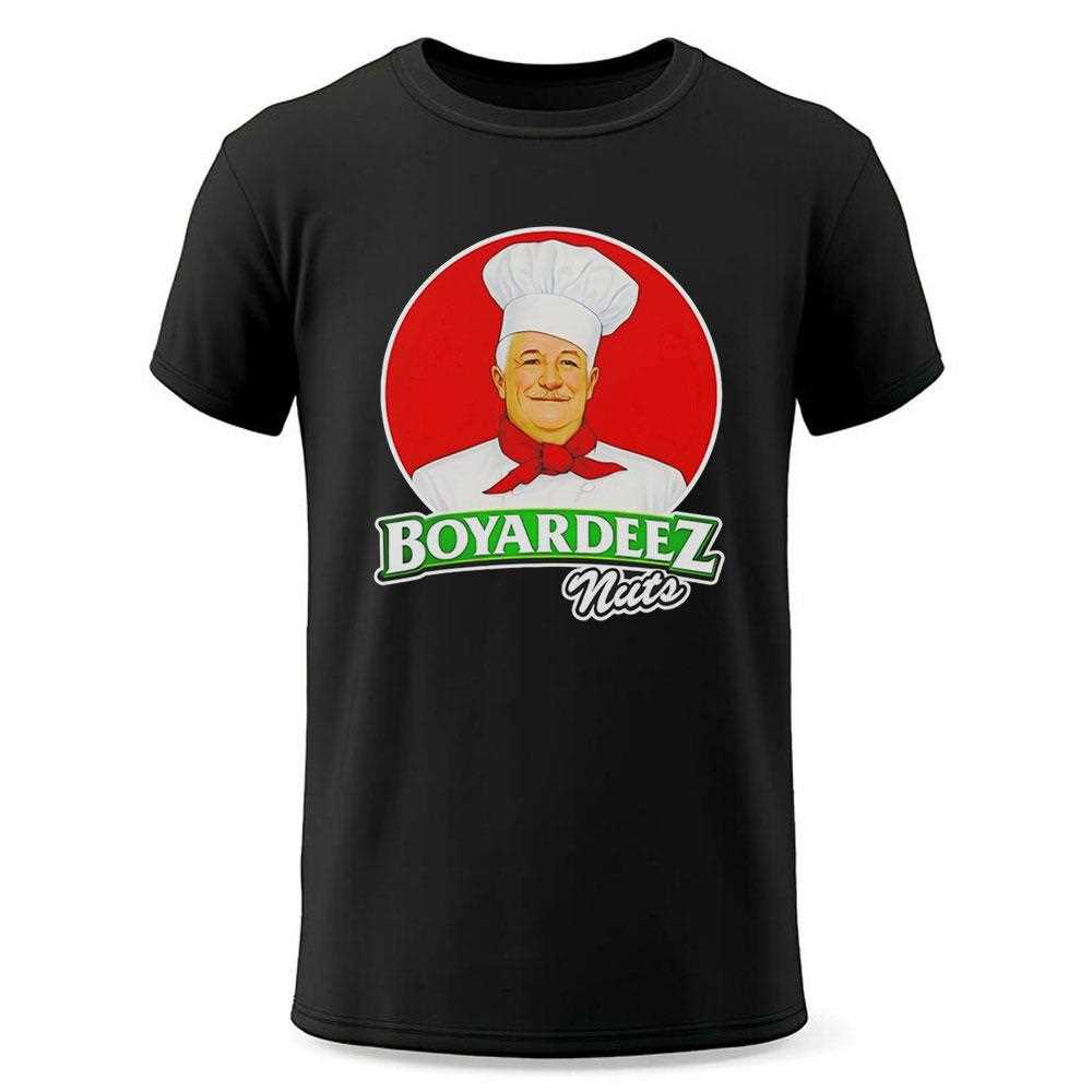 Combine culinary nostalgia with modern internet humor in this hilariously clever “Boyardeez Nuts” mashup. The design features the iconic chef Ettore Boiardi in a vibrant, retro-styled emblem, paired with a witty, tongue-in-cheek slogan that is guaranteed to turn heads and spark laughter. The high-contrast red and white color palette mimics the world-famous branding, creating an instantly recognizable look with a funny twist. This shirt is for the jokers, the meme-lovers, and those who appreciate creative irony in their fashion. Printed on a premium black cotton shirt, the graphics are crisp, vivid, and soft to the touch. The fabric is pre-shrunk and exceptionally breathable, making it an ideal choice for summer barbecues or casual hangouts. Stand out from the garden-variety graphic tees with a design that is as smart as it is silly. It represents a playful bridge between childhood memories and adult humor. Serve up some laughs—order your Ettore Boiardi Boyardeez Nuts Tee now and own the joke!. T-shirt !