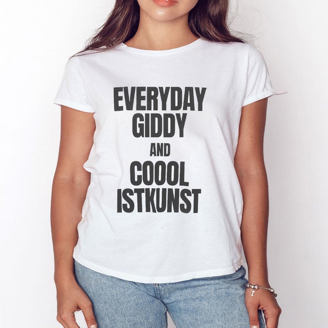Featuring a bold, colorful graphic that reads “Everyday Giddy And Coool Istkunst,” this shirt exudes a sense of joy and positivity that is sure to turn heads wherever you go. Whether you’re running errands, hanging out with friends, or attending a casual event, this shirt will make you feel confident and comfortable in your own skin.