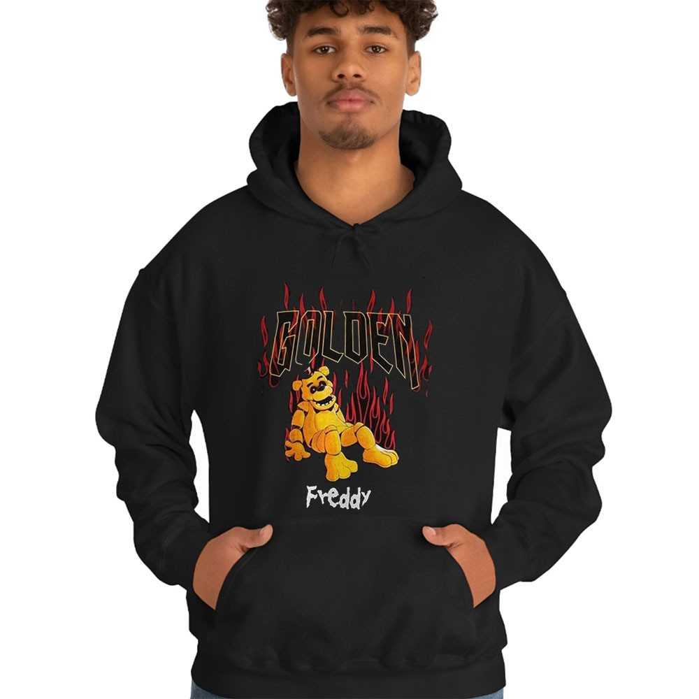 Bring the jump-scares to your wardrobe with this Golden Freddy tee from the FNAF universe. The design features the mysterious animatronic in a “Golden” graphic style, surrounded by retro fire motifs and jagged, horror-inspired text. The warm yellow and orange tones create a striking contrast with the black shirt, making the character appear as if he’s glowing in the dark. It’s a must-have for fans of the Fazbear lore who love a bit of mystery. Don’t be left in the dark—grab your Five Nights At Freddy’s Golden Freddy Tee now!.