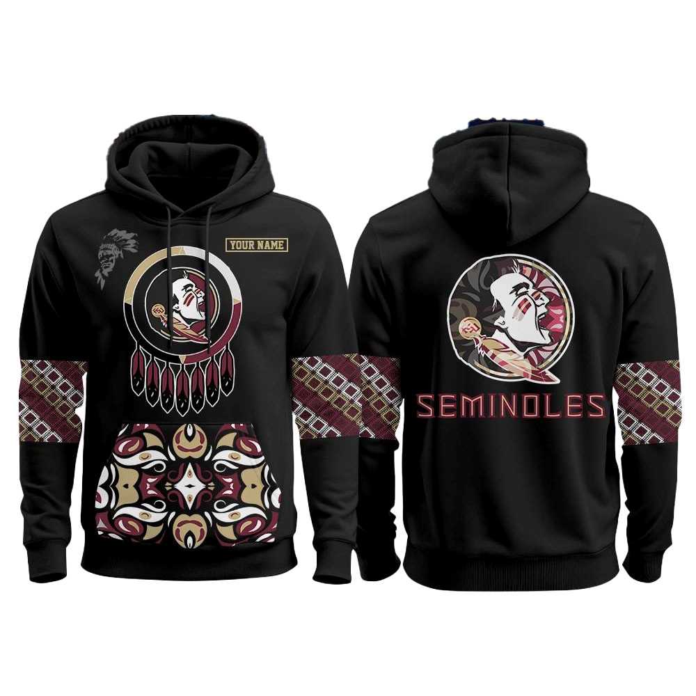 > Embody the “Unconquered Spirit” with our Florida State Seminoles Native American Heritage Month Hoodie, a design created with profound respect and collaboration. The iconic Seminoles spear is central, surrounded by authentic patterns and symbols directly inspired by the rich cultural traditions of the Seminole Tribe of Florida. The vibrant garnet and gold are meticulously integrated with traditional designs, showcasing a deep connection to their heritage, resilience, and strength. This hoodie is more than just fan apparel; it is a powerful acknowledgment and celebration of the Seminole Tribe’s enduring legacy, its history, and its vibrant contemporary culture. Every line and curve reflects genuine artistic motifs, representing a unique bridge between collegiate pride and the deep roots of Indigenous identity. Crafted for comfort and dignity, it serves as a powerful statement of respect and honor, perfect for game days, campus life, or any occasion where you wish to demonstrate your appreciation. By wearing this, you are not just supporting a team, but also honoring a living, breathing culture.