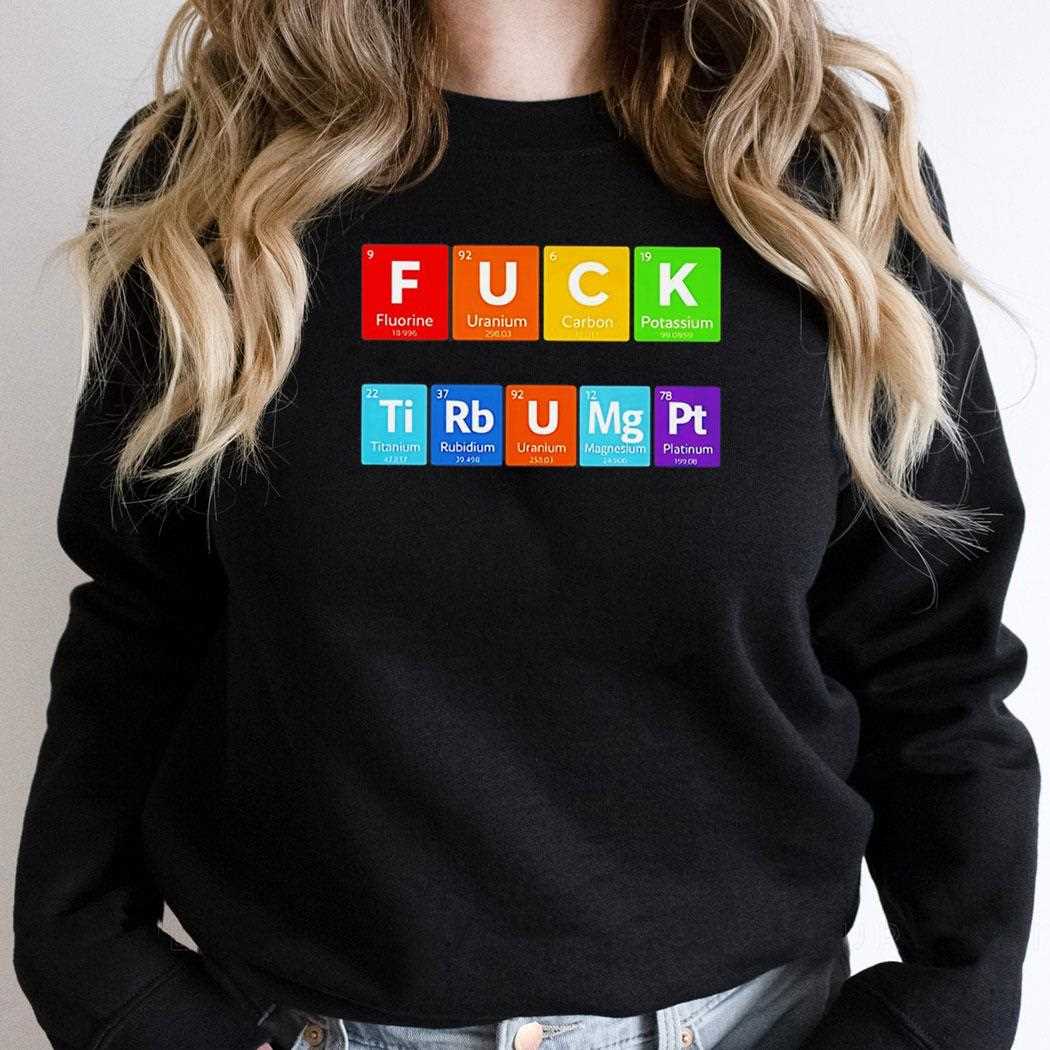 Add a spark of wit to your outfit with this clever periodic table parody. By creatively arranging chemical elements like Fluorine, Uranium, and Carbon, this design sends a bold message for those with a cheeky sense of humor and a love for science. It’s the ultimate “smart” casual wear. Prove your genius and shop for the Ft Chemistry Tee at our store today!. T-shirt !