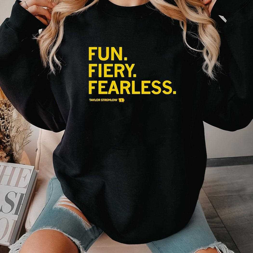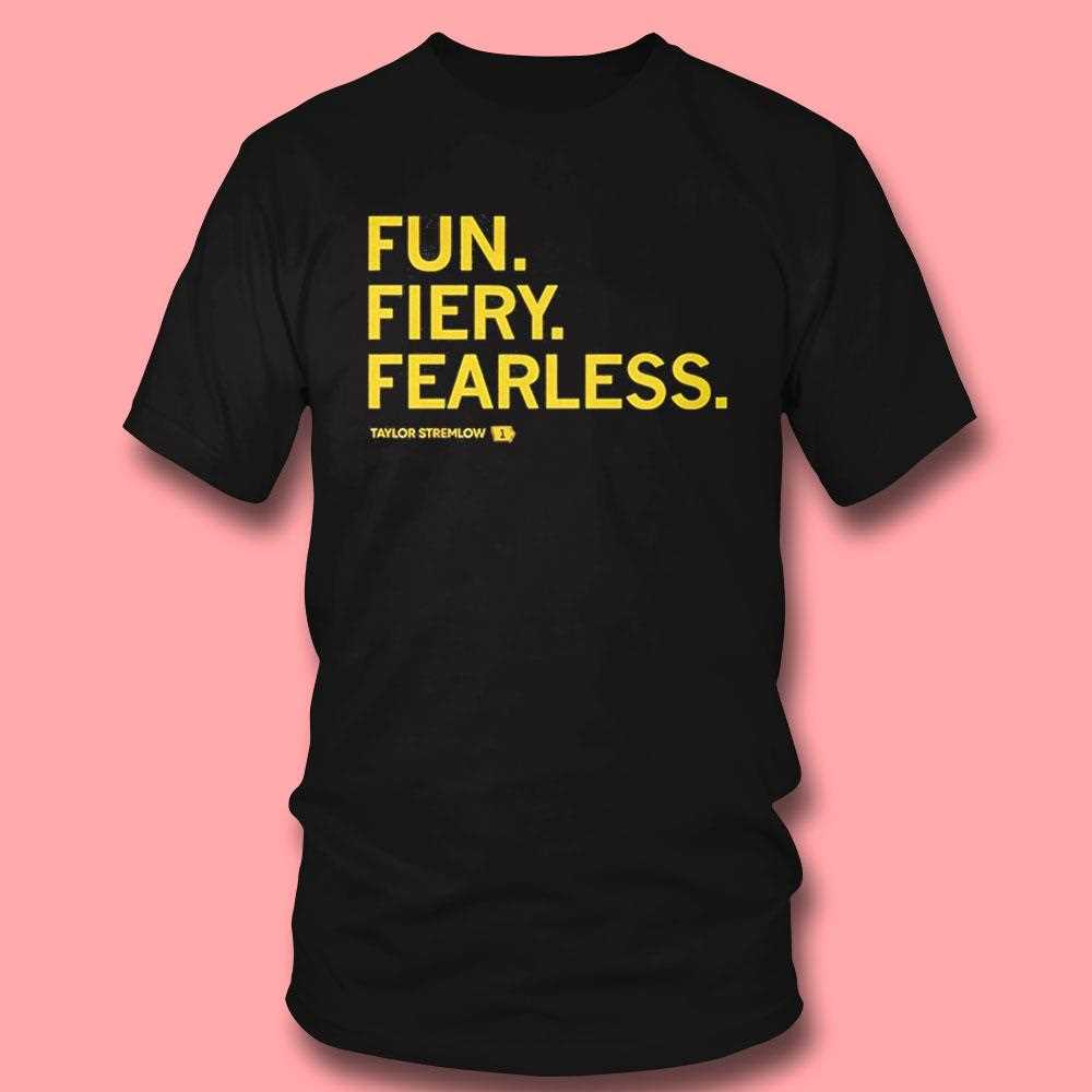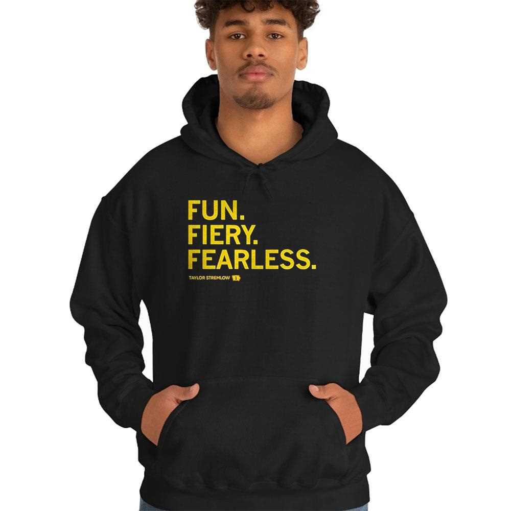 Celebrate the spirit of determination and athletic prowess with this bold typographic masterpiece. Designed for the superfan and the go-getter alike, this t-shirt pays homage to the vibrant energy of Taylor Stremlow. The design utilizes a high-contrast color palette, featuring striking yellow and gold lettering against a deep, solid black canvas. This choice of colors ensures that the message is visible from a distance, making a powerful statement wherever you go. The three adjectives—”FUN. FIERY. FEARLESS.”—are stacked vertically, creating a rhythmic visual hierarchy that builds up to the athlete’s name at the bottom.