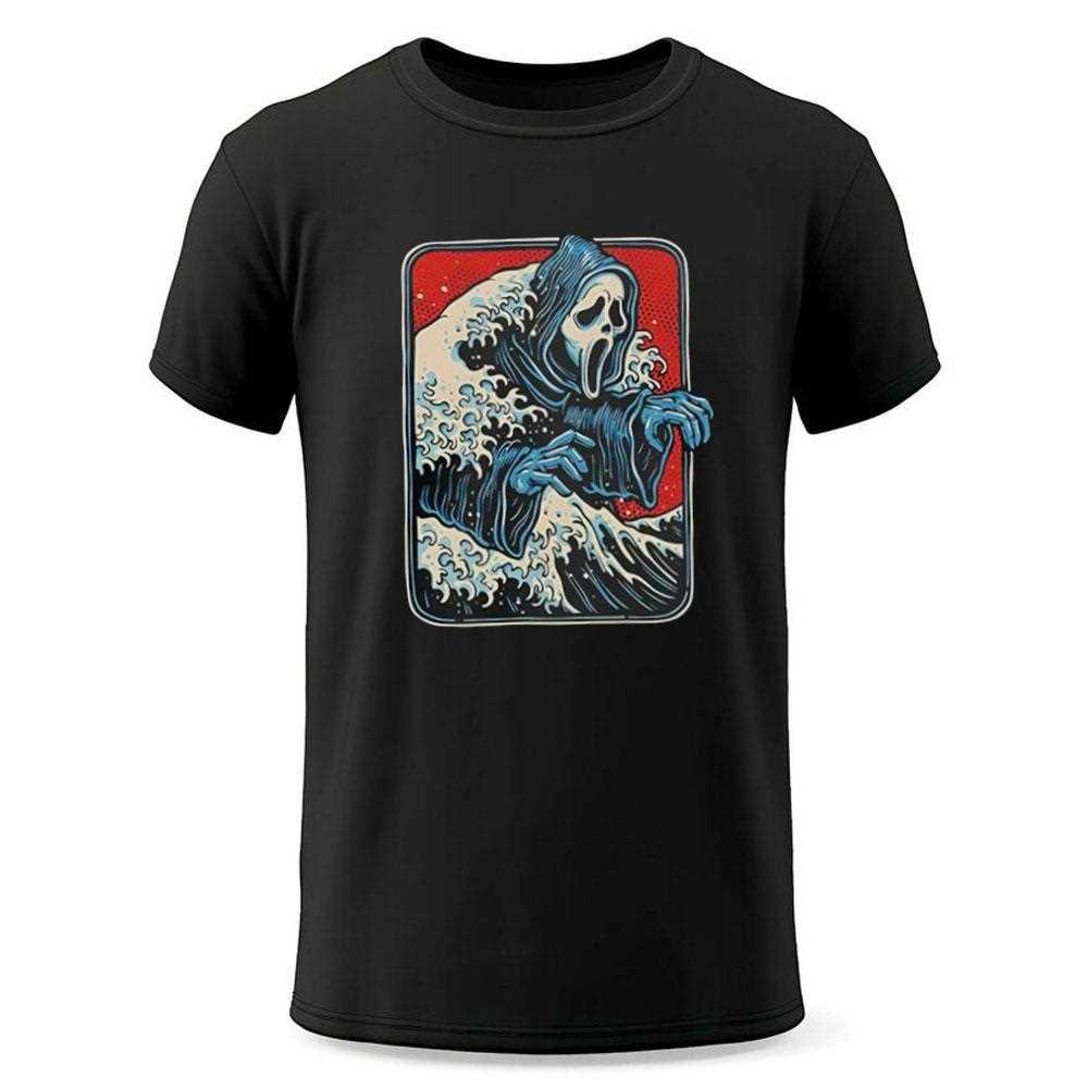 A masterpiece of horror and art history, this t-shirt is the ultimate mashup for the sophisticated slasher fan. The design brilliantly reimagines Katsushika Hokusai’s iconic woodblock print, “The Great Wave off Kanagawa,” but with a terrifying twist: lurking in the crest of the wave is the unmistakable mask of Ghostface from the Scream franchise. The “GHOST WAVE” is a perfect, witty, and beautifully executed piece of pop culture art, blending the serene, powerful beauty of classic Japanese art with the heart-pounding terror of a modern horror icon. It’s a must-have for any fan who appreciates a clever, artistic, and slightly sinister design.