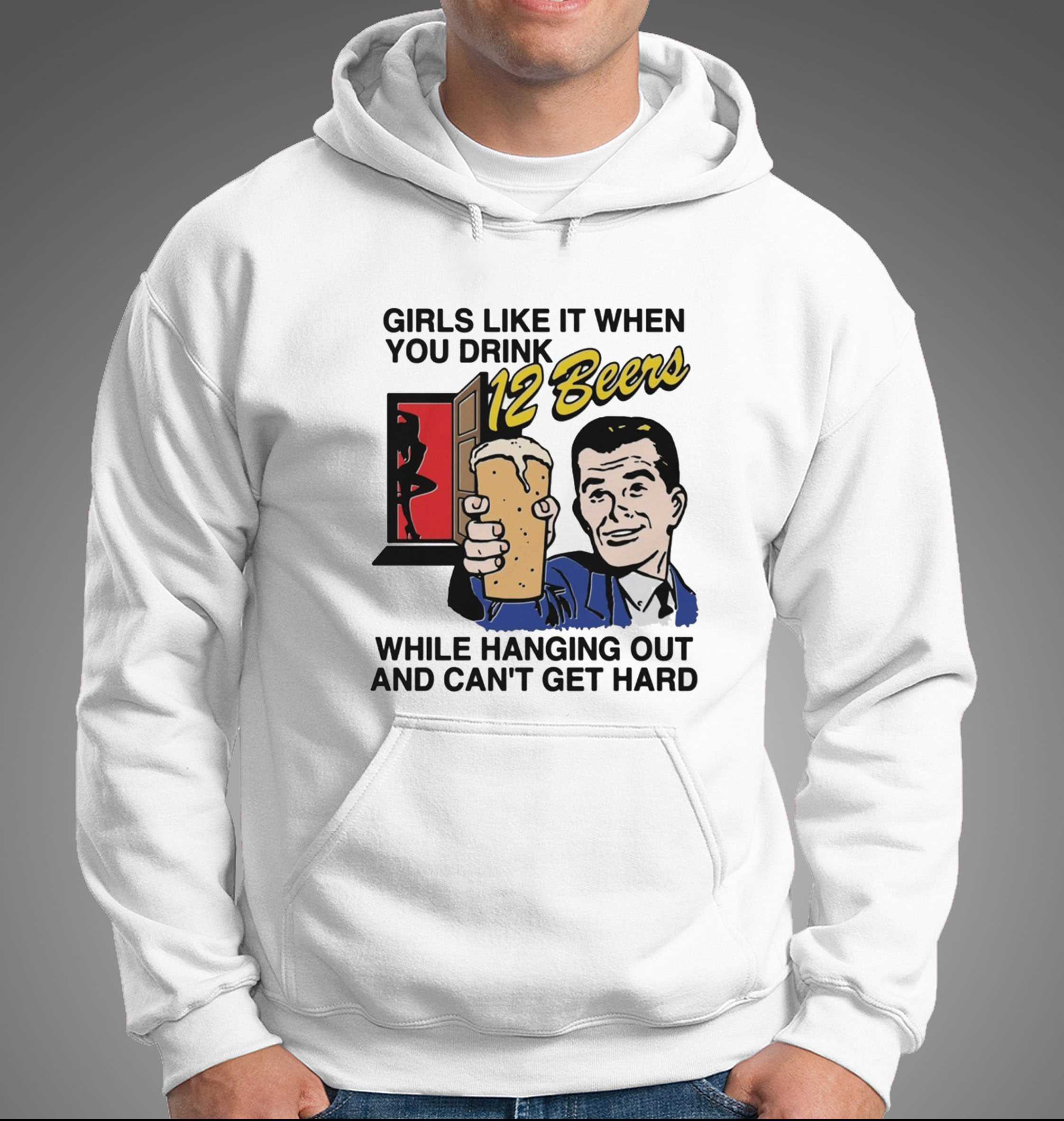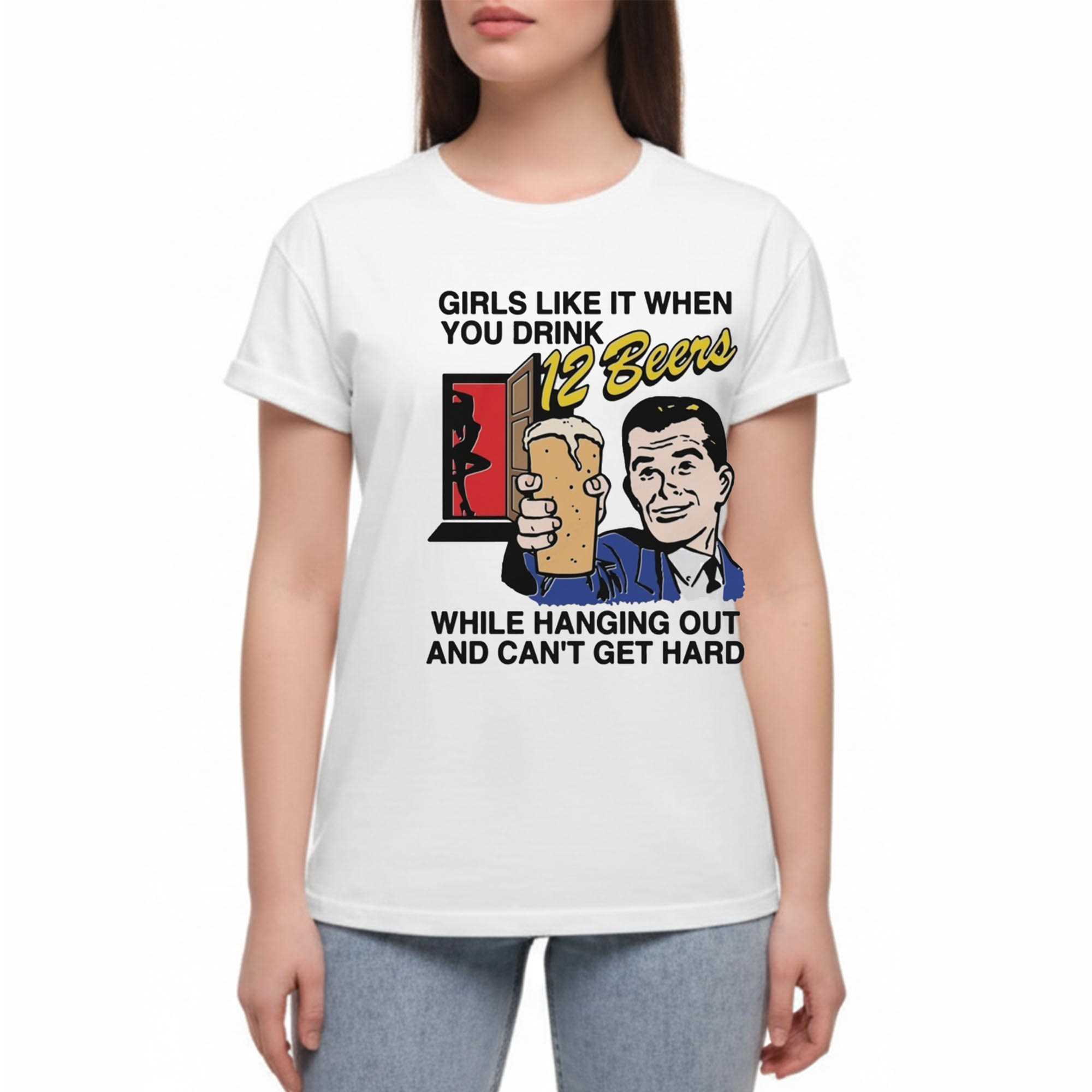 Break the ice with the ultimate self-deprecating humor in the Girls Like It When You Drink 12 Beers While Hanging Out And Cant Get Hard Tee. This design is a brilliant and creative take on “honesty is the best policy” fashion, featuring a retro-style comic book illustration of a couple in a hilariously awkward social situation. The massive, wordy slogan is rendered in a fun, 1950s-inspired typography that adds a layer of ironic charm to the very modern and slightly “too much information” message. It’s the perfect design for those who love to be the life of the party and isn’t afraid to laugh at themselves and the absurdities of dating and drinking culture. The high-contrast blue and red accents pop vividly against the clean white background, creating a look that is both energetic and eye-catching. This tee is more than just a joke; it’s a legendary conversation starter that is guaranteed to get people talking (and laughing) at any bar or social gathering. Crafted from ultra-soft, premium cotton, it offers a comfortable, lightweight fit that’s perfect for long nights out with friends. The print is high-resolution and durable, designed to withstand the rigors of a “12-beer” evening. Show off your sharp wit and your fearless personality. Don’t take life too seriously—just wear it. Grab your Girls Like It When You Drink 12 Beers While Hanging Out And Cant Get Hard Tee today!. T-shirt !