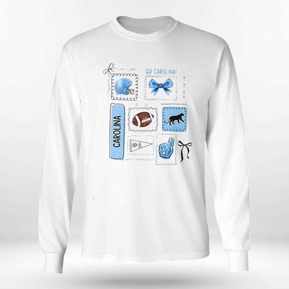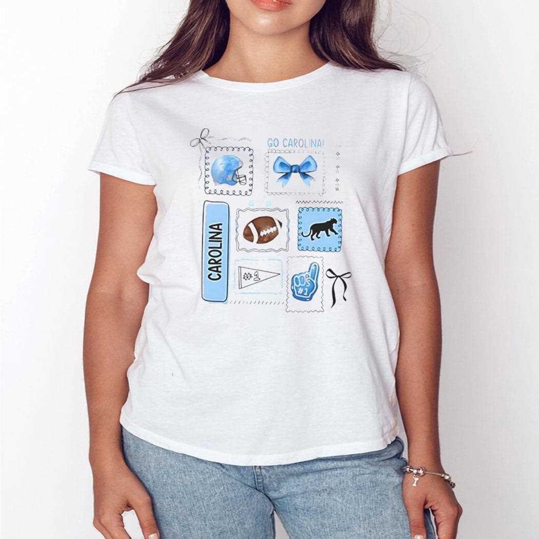 Pounce on this stylish Carolina fan tee. The design showcases the sleek silver and blue helmet of the Panthers, creatively accessorized with a matching bow graphic. The layout includes cute illustrations of foam fingers, megaphones, and stars, creating a festive, “cheerleader-chic” vibe. The soft blue tones usually associated with Carolina are vibrant here, making the design pop against the white fabric. It’s a fresh, playful take on NFL merchandise that stands out in a sea of generic jerseys. Show your panther pride and buy the Go Carolina Football Helmet Bow Panther #1 Fan Graphic Team Spirit Tee today!. T-shirt !