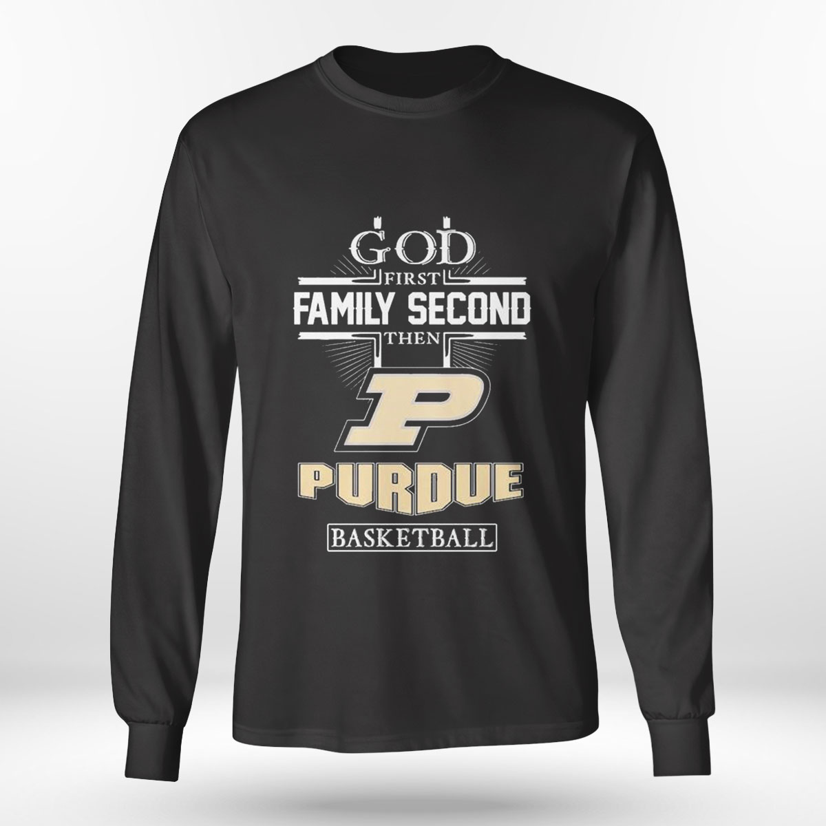 God Family Second First Then Purdue Basketball Shirt Longsleeve T-shirt is a stylish, comfy shirt. Made of 100% cotton, it is cool and soft and keeps you cool in summer days. This edgy shirt comes in different colors, but the black stands out the most and matches with everything. It has many uses like casual wear, party wear, office wear and much more. Product details: