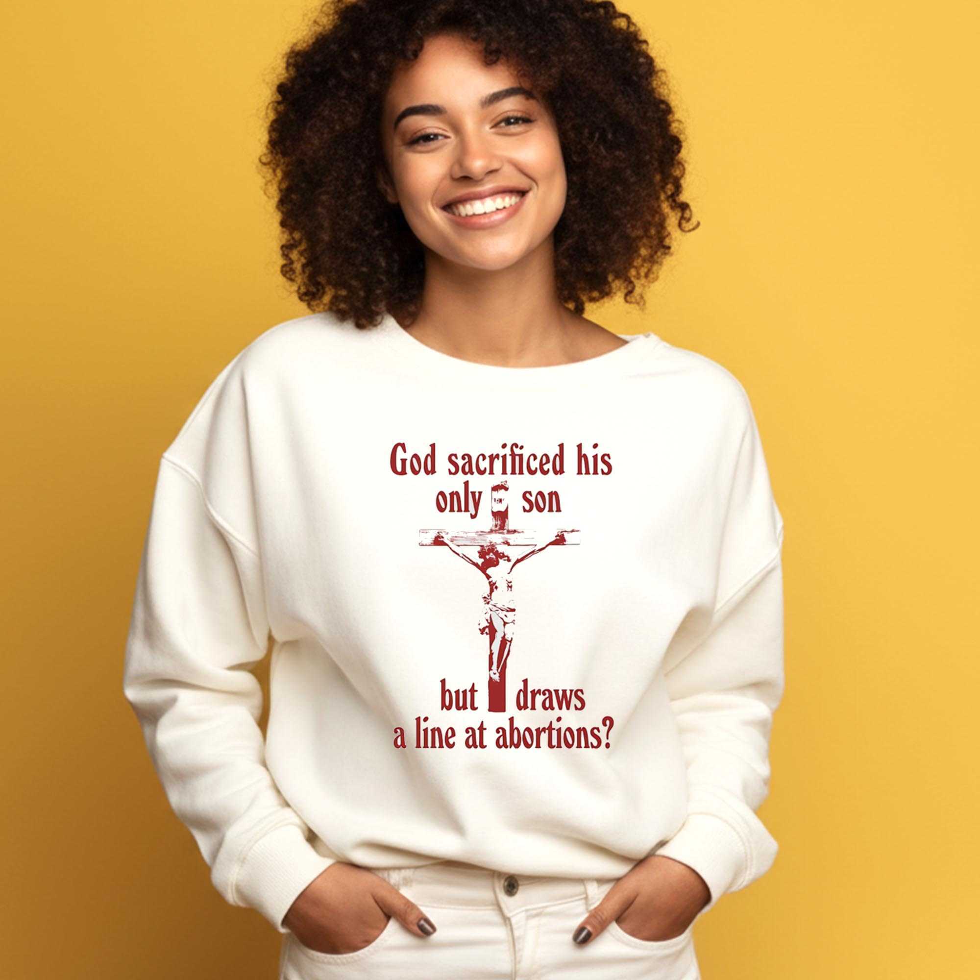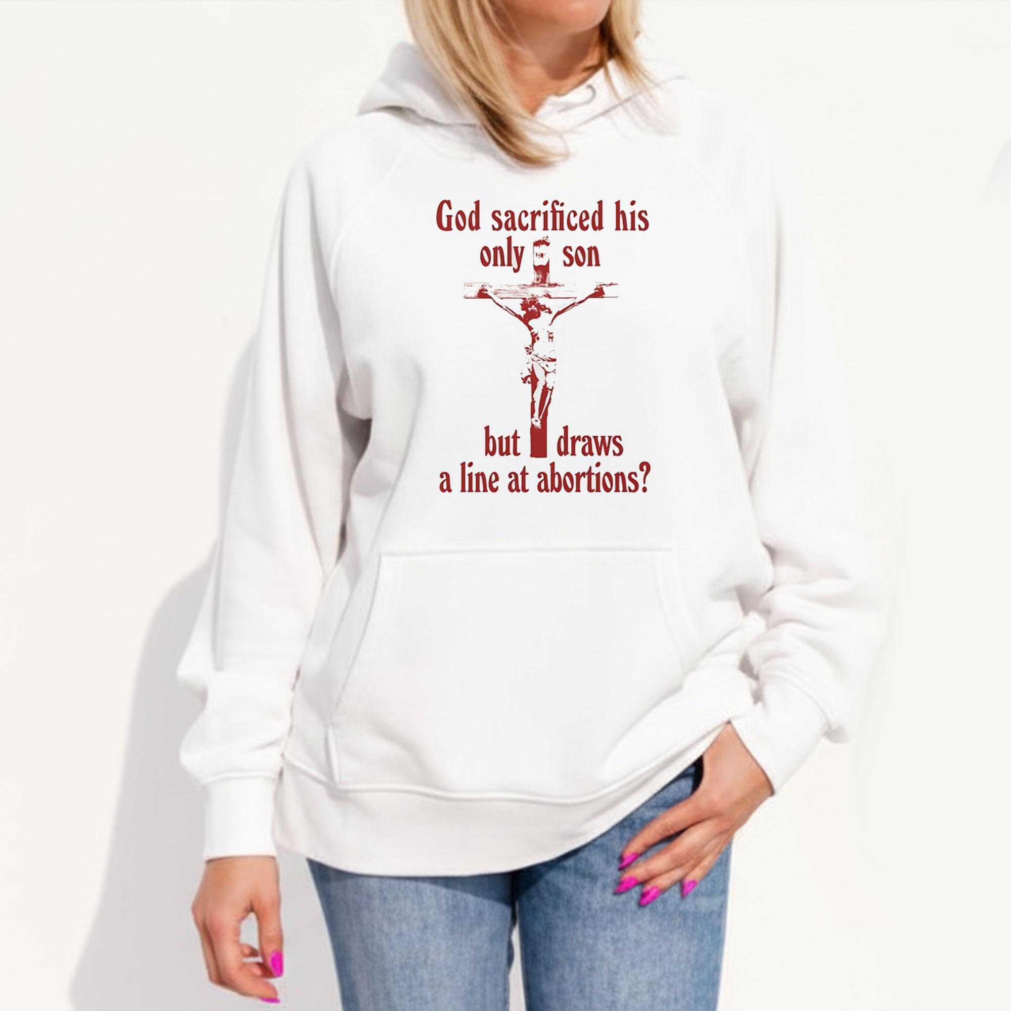 Make a provocative and independent statement with the God Sacrificed His Only Son But Draws A Line At Abortions Tee. This design is a powerful piece of visual social commentary, featuring a high-contrast graphic that challenges institutional narratives and traditional stances through the lens of logic and reflection. The artwork uses a clean and authoritative layout, centered on a stylized “line” motif that reflects the spirit of an independent thinker who isn’t afraid to speak truth to power. Accompanied by the bold and defiant slogan, it signals your membership in a movement that values personal autonomy and critical thought.