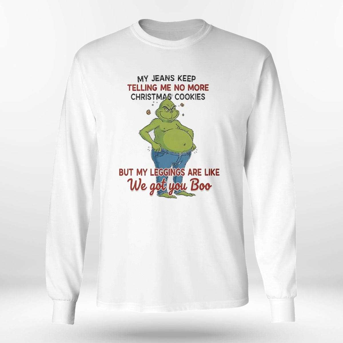 relatable humor meets holiday festivity in this funny Grinch design. The graphic features the Grinch looking slightly regretful or stuffed, with the text “My Jeans Keep Telling Me No More Christmas Cookies… But My Leggings Are Like ‘We Got You Boo’.” It speaks to the universal struggle of holiday overeating and the comfort of stretchy pants. The design is lighthearted and fun, perfect for wearing to Christmas dinner or cookie exchange parties. Indulge in comfort and purchase the Grinch My Jeans Keep Telling Me No More Christmas Cookies Tee right now!. T-shirt !