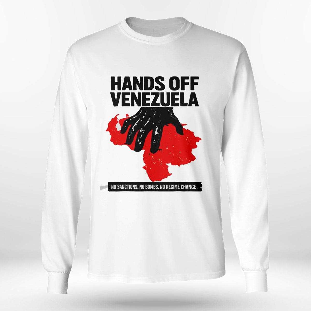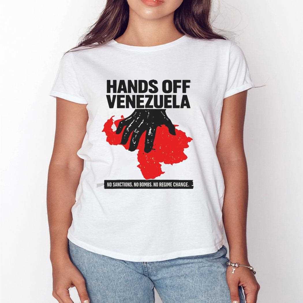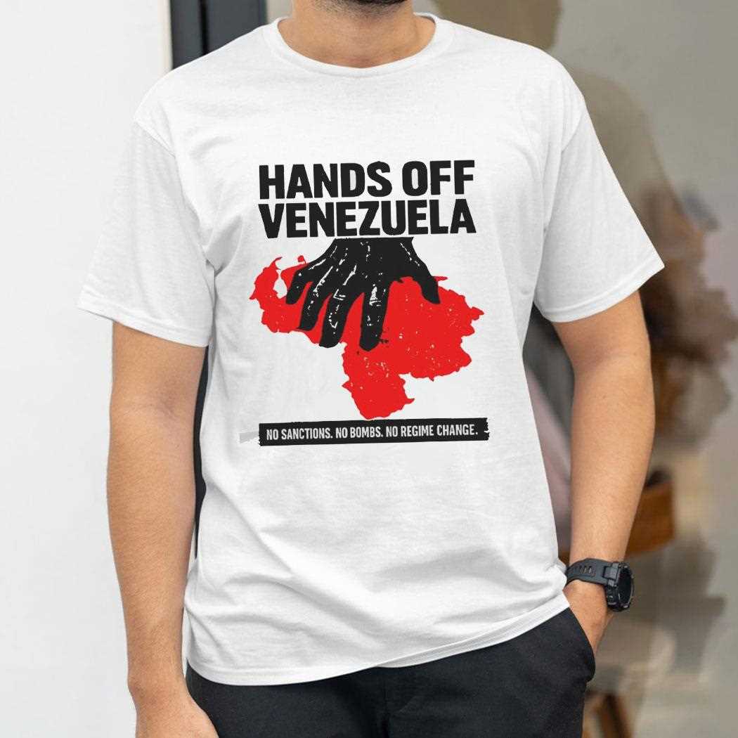 Express your unwavering commitment to peace and justice with the “Hands Off Venezuela” political advocacy tee. This design is a direct and powerful call to action against intervention, featuring a bold, multi-point slogan: “No Sanctions, No Bombs, No Regime Change.” The graphic showcases a high-contrast, artistic rendition of the Venezuelan fist raised in defiance, surrounded by the colors of the national flag. This shirt is designed for activists, students, and global citizens who believe in the right of every nation to determine its own future. Crafted from a durable, heavy-weight cotton blend, it provides a structured fit and long-lasting comfort for long days of protest and social engagement. The high-resolution screen print ensures the uncompromising message remains vivid and sharp, making it an impactful piece of gear for any rally or public event. Wear your convictions on your chest and show the world where you stand on the issues of sovereignty and international law. Demand a future of peace and respect—secure your Hands Off Venezuela No Sanctions No Bombs No Regime Change Tee today!. T-shirt !