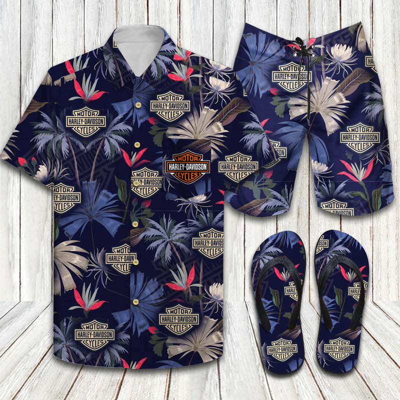 Harley Davidson Floral Hawaiin Shirt Shorts and Flip Flops Combo