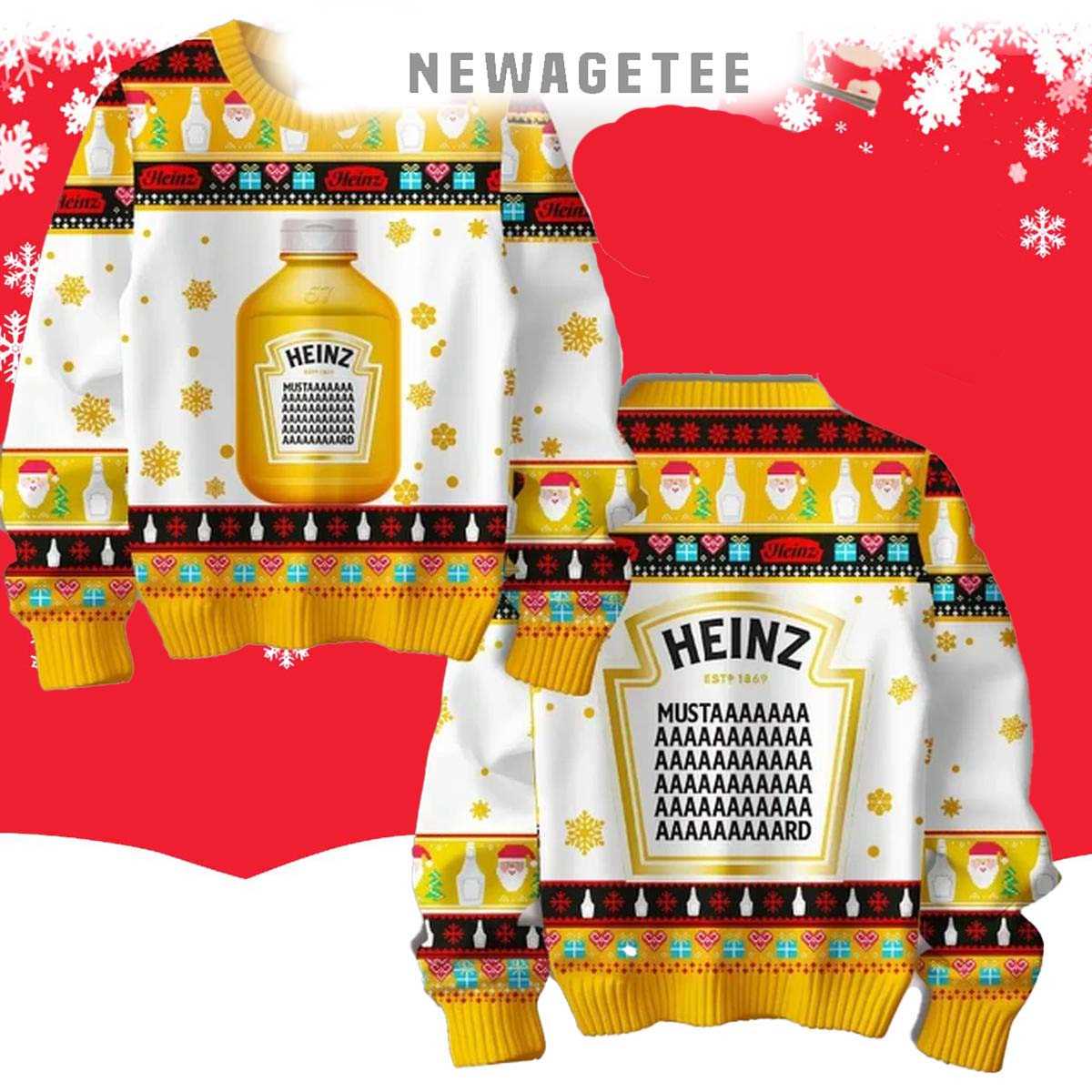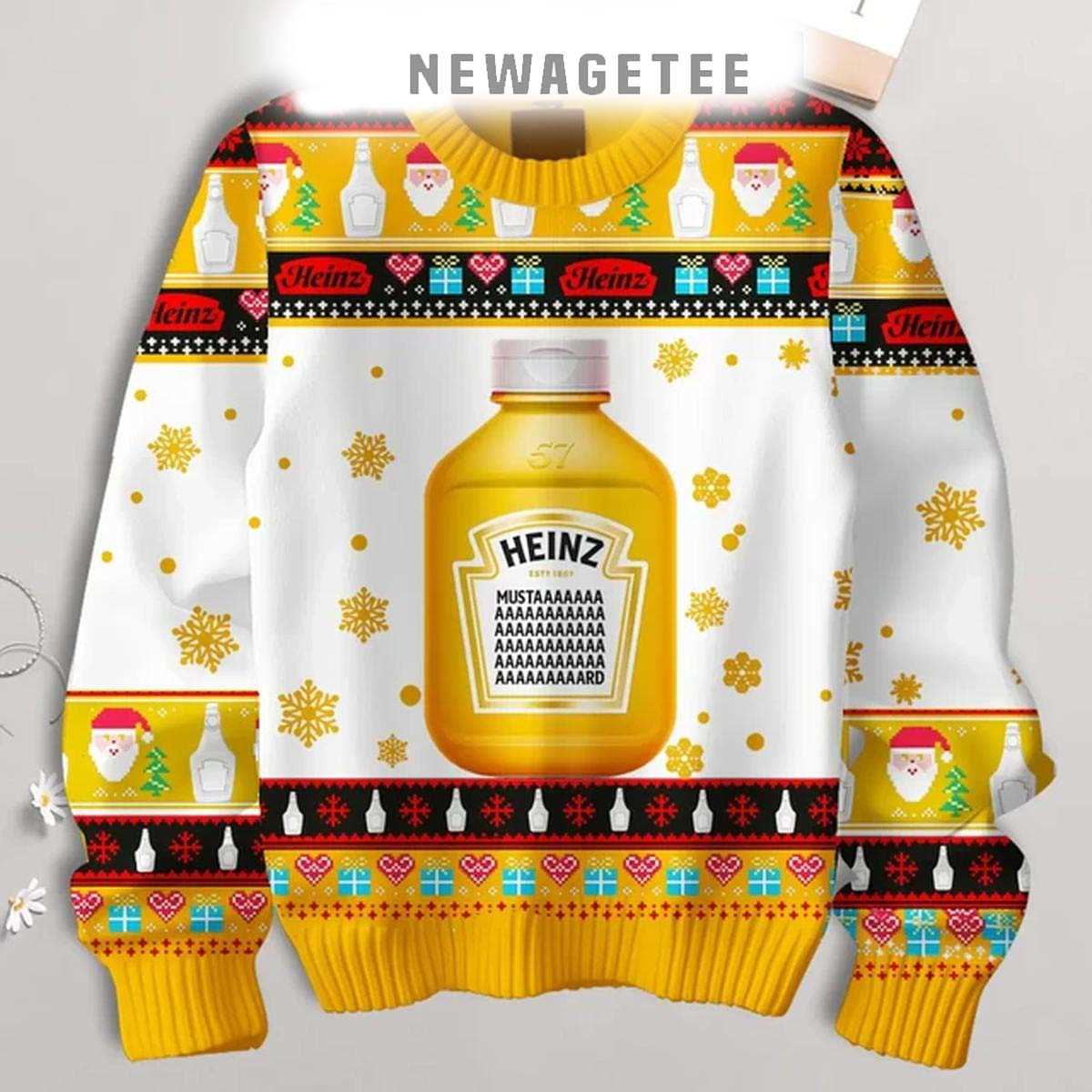 Intricate patterns of miniature mustard swirls, tiny snowflakes, and subtle “2025” dates crisscross the fabric, forming a rich tapestry that invites closer inspection. Look carefully, and you might spot hidden details: little festive food items like pretzels or fries (ready for dipping), or even a subtle “It’s Not Enough!” message cleverly disguised within a holiday border. The sleeves are a playful parade of alternating stripes of yellow and red, each adorned with a repeating motif of a mustard bottle or a stylized star. The cuffs and hem are comfortably ribbed, ensuring a snug and cozy fit, perfect for keeping warm while enjoying all your holiday treats. A special, embroidered “Limited Edition 2025” tag is subtly placed near the bottom, marking this sweater as a unique and collectible item for fans of all things Heinz. The back of the sweater often features a larger, more abstract depiction of the Heinz logo or a festive condiment-themed scene, ensuring your quirky holiday spirit is visible from every angle. Crafted from a high-quality, soft-touch acrylic knit, this sweater promises exceptional warmth and comfort, making it ideal for chilly winter evenings or lively indoor celebrations. The material is designed to be durable, retaining its vibrant colors and playful details wash after wash, so you can proudly display your love for Heinz Mustard (and Christmas!) for many seasons to come. It’s a delightfully absurd yet charming piece that balances humor, holiday cheer, and a touch of nostalgic brand loyalty perfectly.