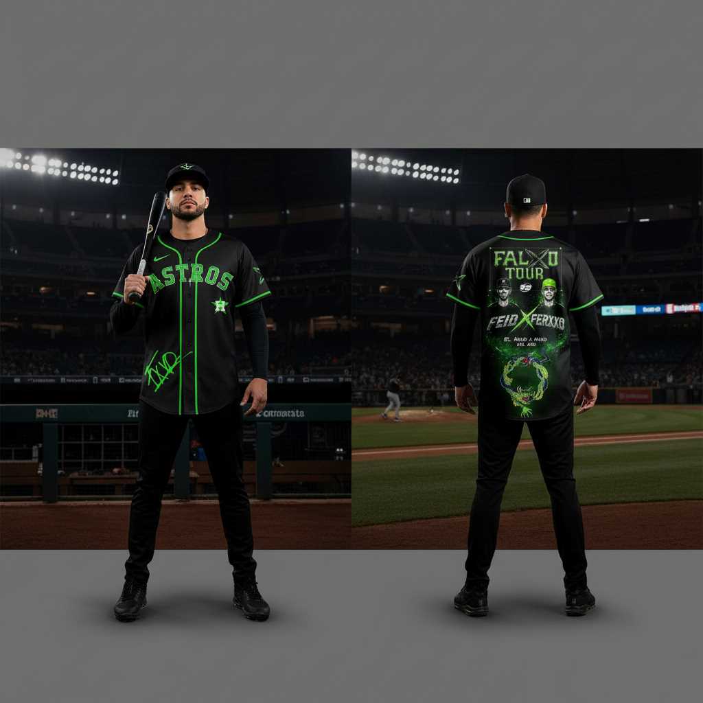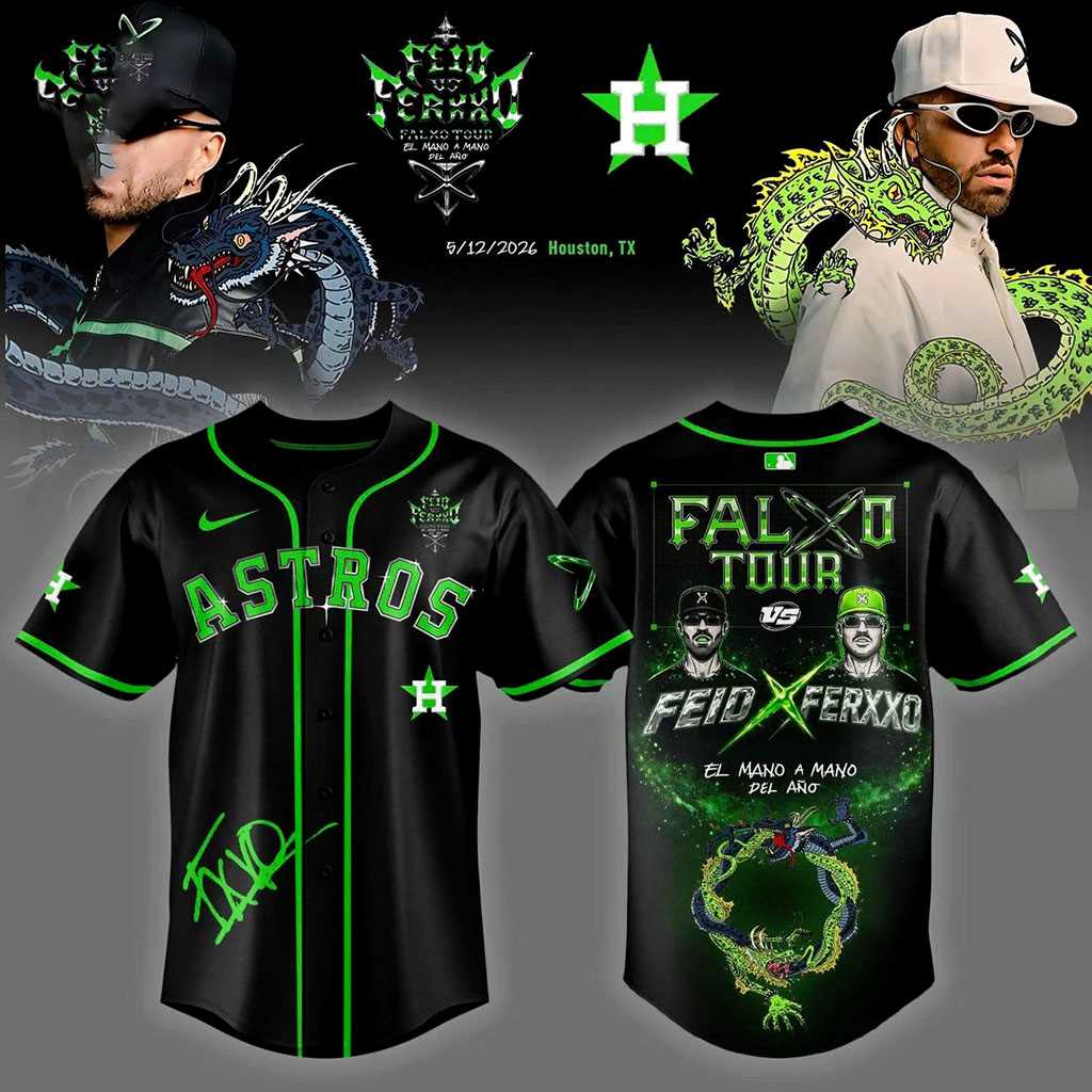 Hit a style home run with the Houston Astros FEID vs FERXXO Falxo Tour 2026 Baseball Jersey! This striking black and neon green design brilliantly merges sports and concert culture. The front proudly displays “ASTROS” in vibrant neon green with the iconic “H” star logo and a subtle green “XD” signature. The back features “FALXO TOUR” above two playful cartoon characters – one in a green cap, one in shades – introducing “FEID x FERXXO,” flanked by “EL MAFI A MAKO” and “ARE ARE.” Below, an intricate, glowing neon green dragon graphic completes the electrifying aesthetic. It’s an audacious statement for fans who love a unique mashup of epic games and unforgettable music tours.