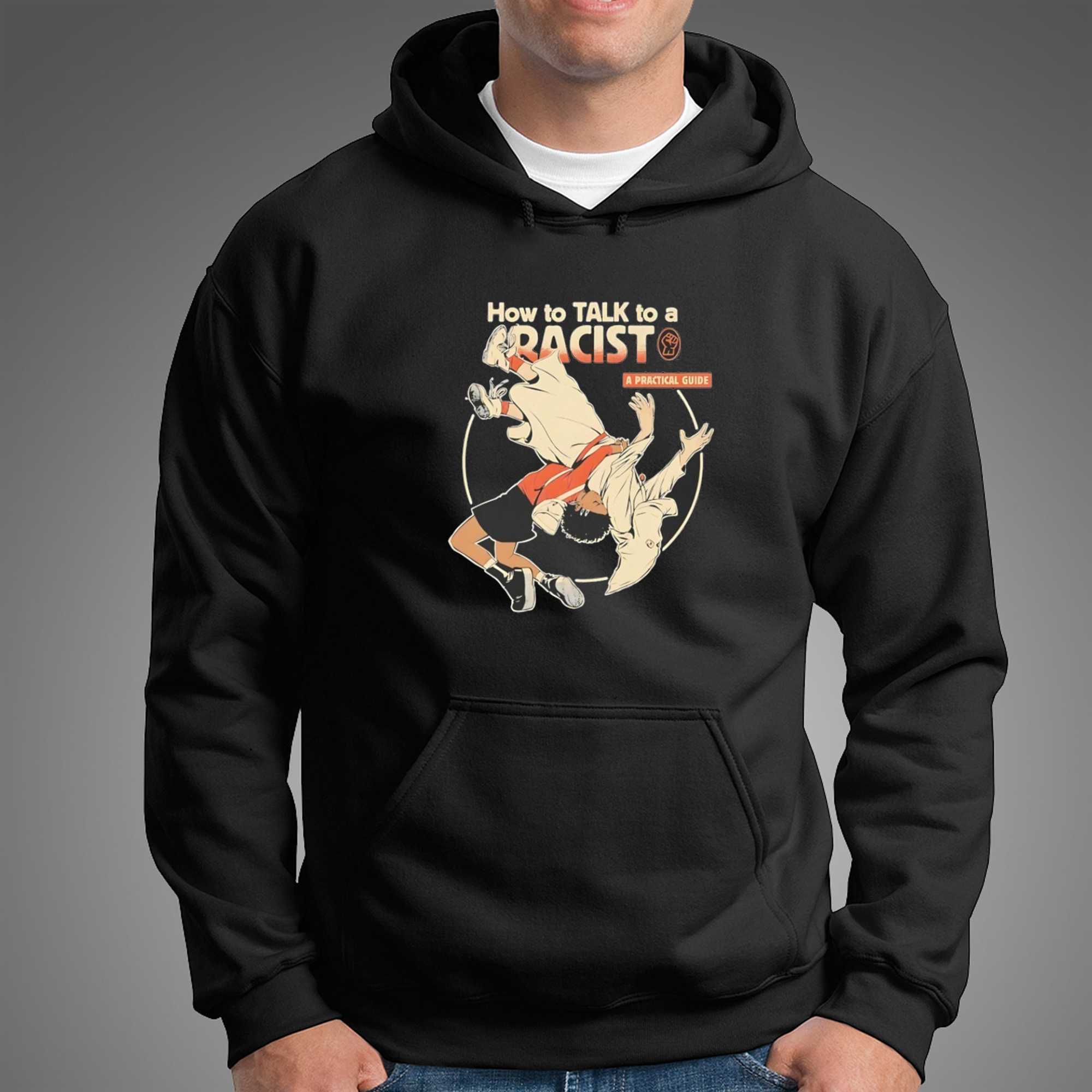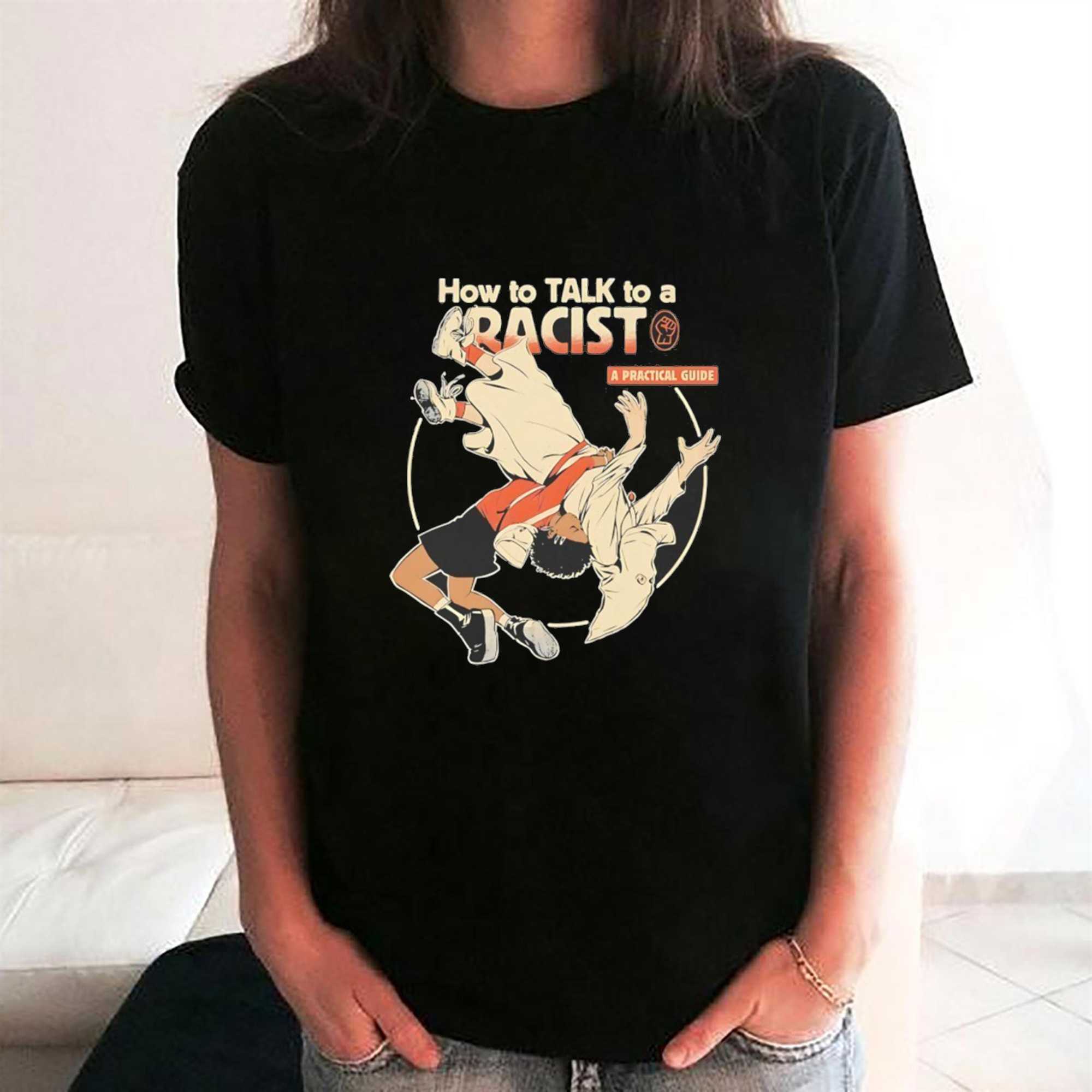 Get ready to make a bold statement with the “How to talk to a racist a practical guide Tee”! This incredibly witty design masterfully flips the script on confronting prejudice. It features dynamic, vintage-inspired artwork where a strong, dark-skinned figure with an Afro, sporting a red and white top and black shorts, is powerfully executing a martial arts throw on another character clad in a white, KKK-style robe and hood. The text “How to TALK to a RACIST” boldly crowns the image, with “A PRACTICAL GUIDE” highlighted in a red box, humorously suggesting that the “talk” involves a definitive physical lesson. A striking orange-red fist symbol replaces the ‘O’ in “RACIST,” reinforcing the shirt’s unapologetic stance against bigotry and its powerful, confrontational humor. It’s a visual metaphor for taking down hate with direct, impactful action.
