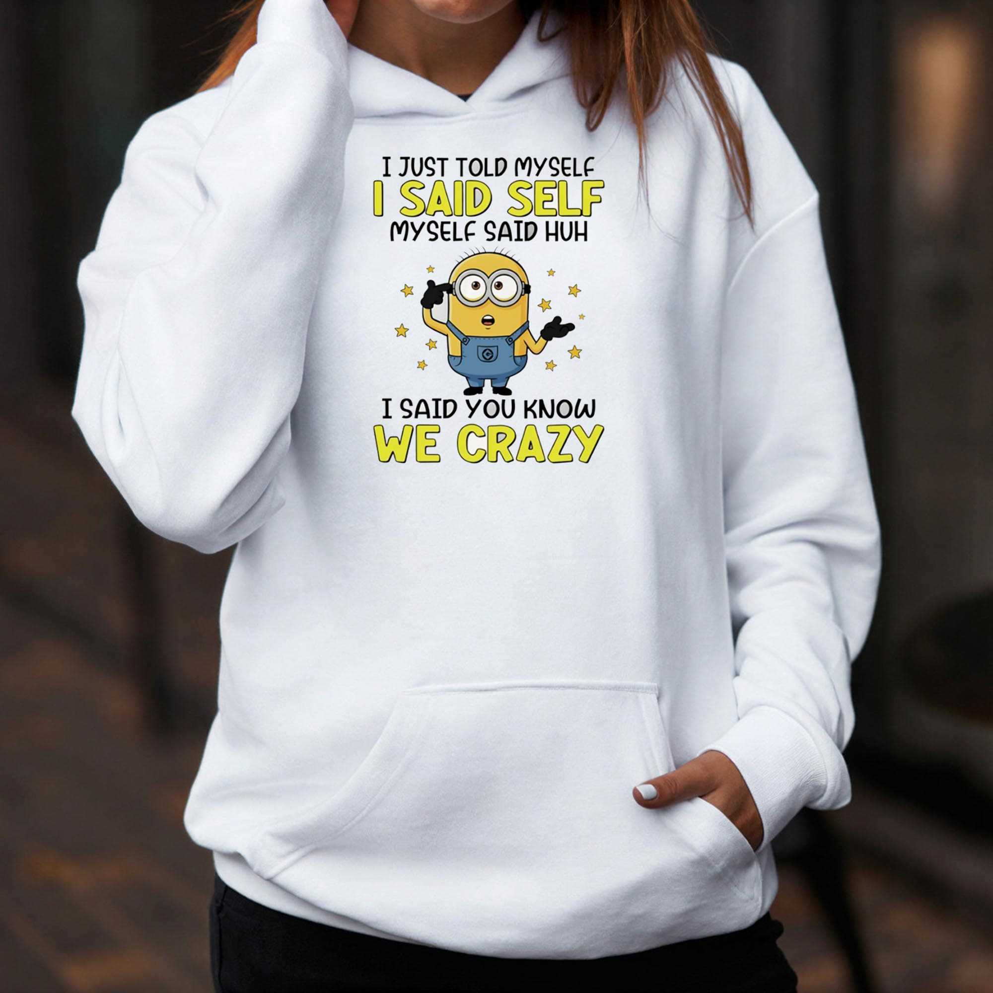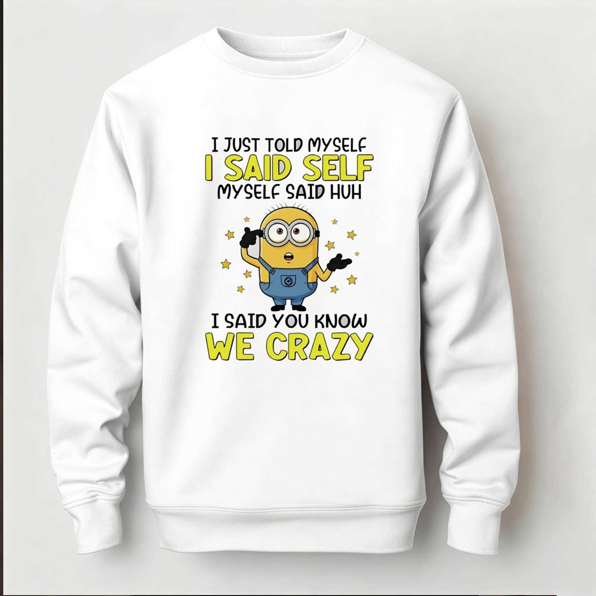 Add a side of whimsical and unhinged humor to your daily rotation with the I Just Told Myself I Said Self Myself Said Huh I Said You Know We Crazy Tee. This design features a hilarious, high-detail graphic of a chaotic yellow “Minion” character, perfectly embodying the high-energy and slightly confused persona described in the wordy slogan. The text is rendered in a friendly, hand-drawn font that balances the sharp humor with a touch of playful charm. It’s a brilliant gift for the “chaos coordinators” in your life or for yourself as a badge of honor for embracing your unique quirks. The vibrant yellows and blues of the graphic pop vividly against the deep black fabric, creating a look that is both fun and easy to wear. This tee is more than just a joke; it’s a celebration of personality and the reality of navigating the world with a little bit of madness. Crafted from soft, premium cotton, it offers a comfortable and breathable fit that is perfect for running errands, casual meetups, or just lounging at home with your own “self.” The print is high-quality and designed to stay bright, ensuring your humorous message remains clear for years. Show off your wit and your spirit animal. Don’t suppress your inner crazy—celebrate it. Grab this limited-run look and buy the I Just Told Myself I Said Self Myself Said Huh I Said You Know We Crazy Tee today!. T-shirt !