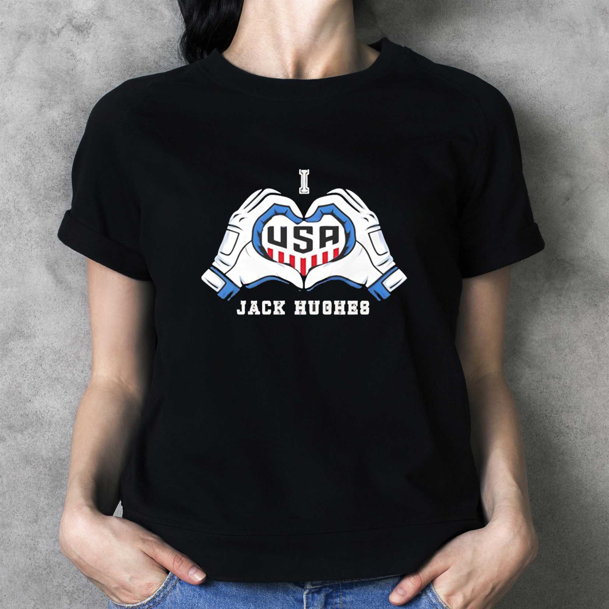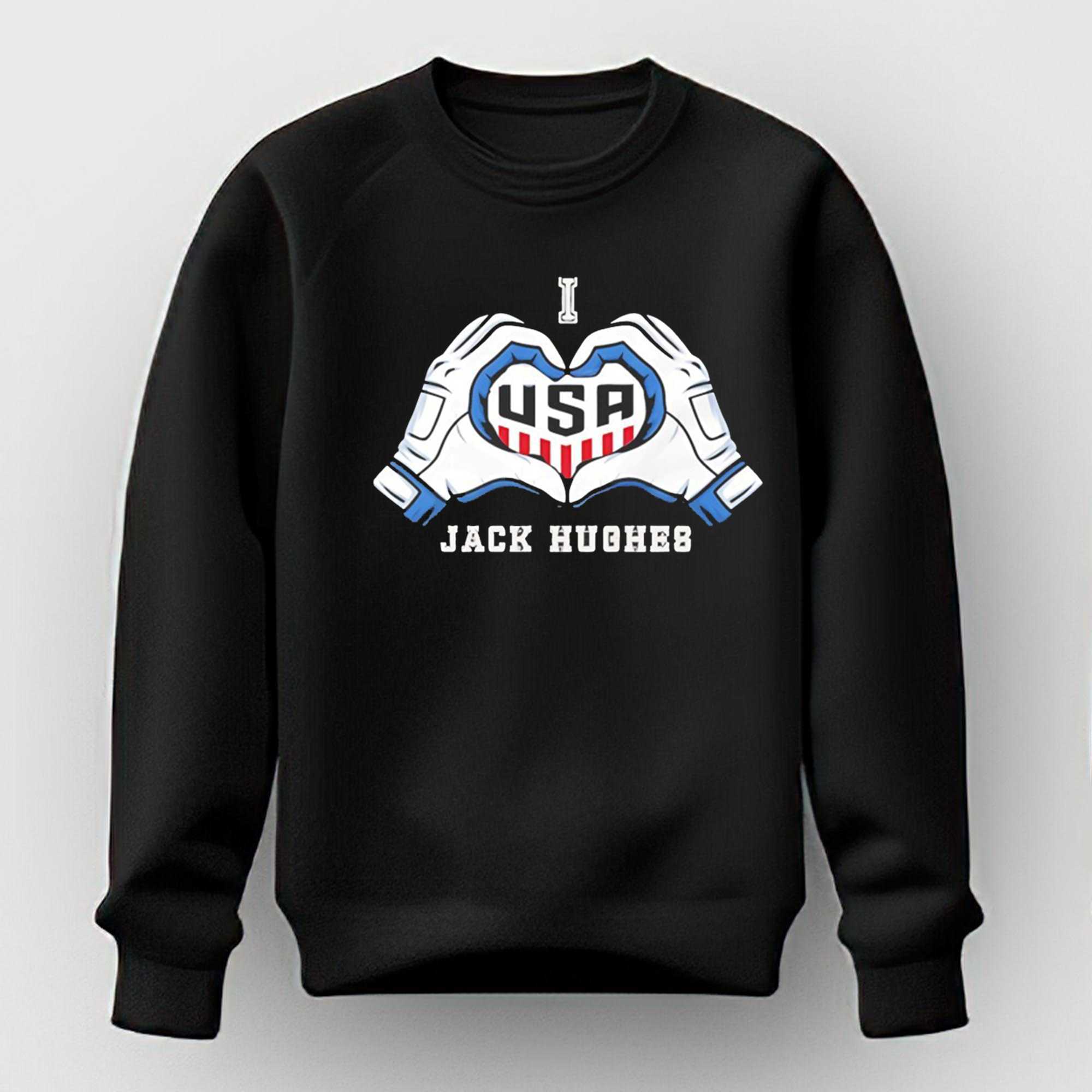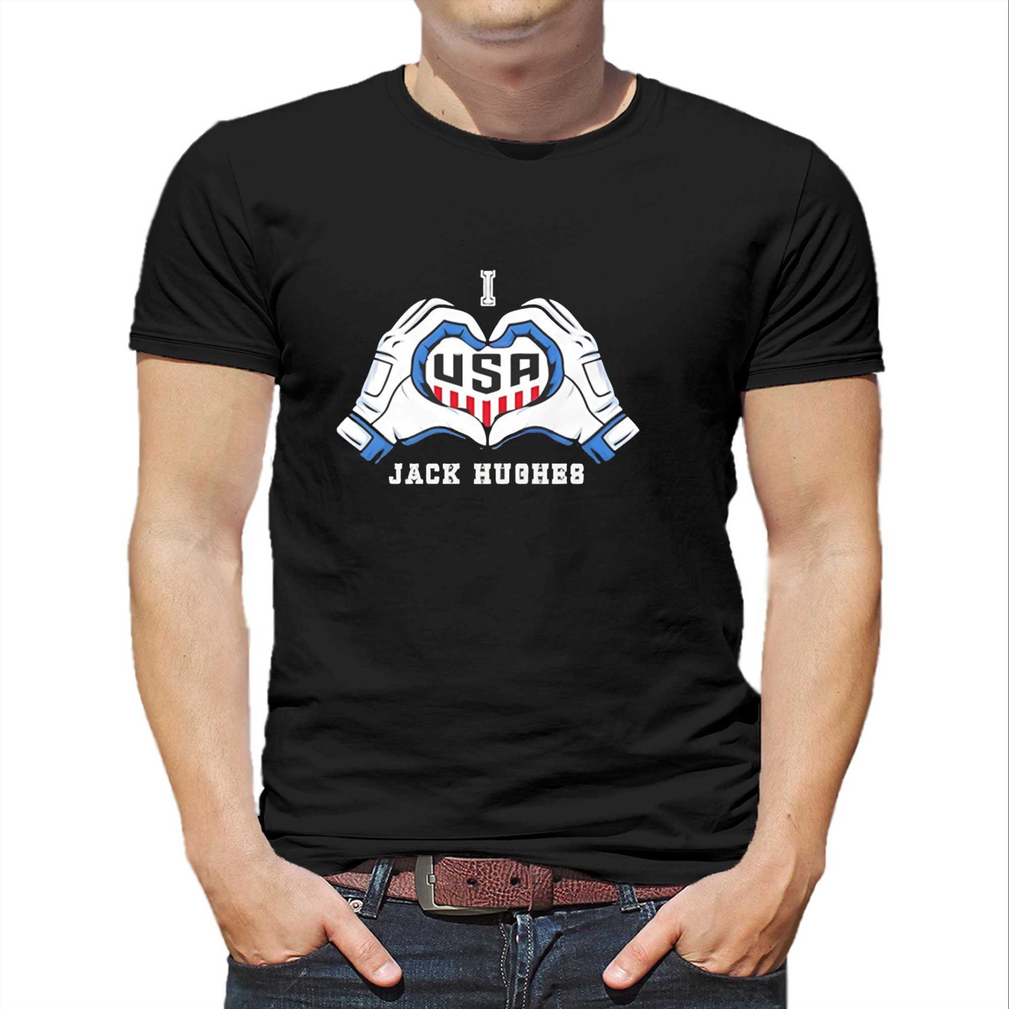 Celebrate the absolute dominance and the championship pedigree of American hockey’s brightest star with the I Love Jack Hughes Winner Usa Hockey Tee. This design is a high-octane tribute to the “Hughes Era” of international play, featuring a stunning photographic graphic of Jack in the iconic USA sweater. The artwork captures the focus, the skill, and the collective roar of a fan base that lives for the peak of international competition. The use of traditional red and blue on a deep black background creates a look that is both professional and intensely athletic, mirroring the energy of a gold-medal game.