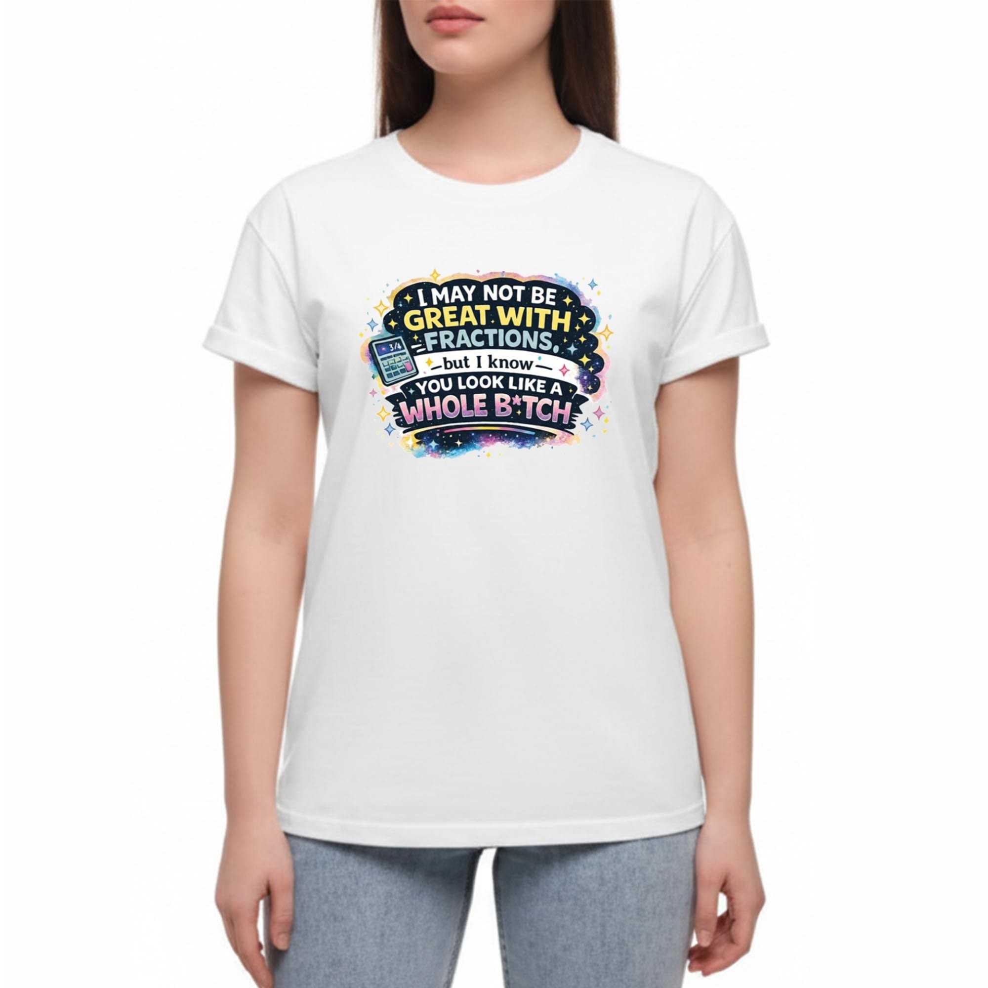 “I May Not Be Great With Fractions But I Know You Look Like A Whole Tee” perfectly encapsulates the humor of this design. This eye-catching graphic features a vibrant, watercolor-galaxy background in deep blue, purple, pink, and yellow, sprinkled with sparkling stars and a glittery outline. Dominating the center, the witty text declares, “I MAY NOT BE GREAT WITH FRACTIONS,” rendered in bold yellow and white lettering, accompanied by a small calculator displaying “3/4” to its left. The phrase then cleverly concludes with “…but I know YOU LOOK LIKE A WHOLE B*TCH,” in a striking pink-to-purple gradient. This design blends playful aesthetics with a confident, cheeky attitude, making it an instant conversation starter for anyone who loves sassy humor and a math pun with an edge.