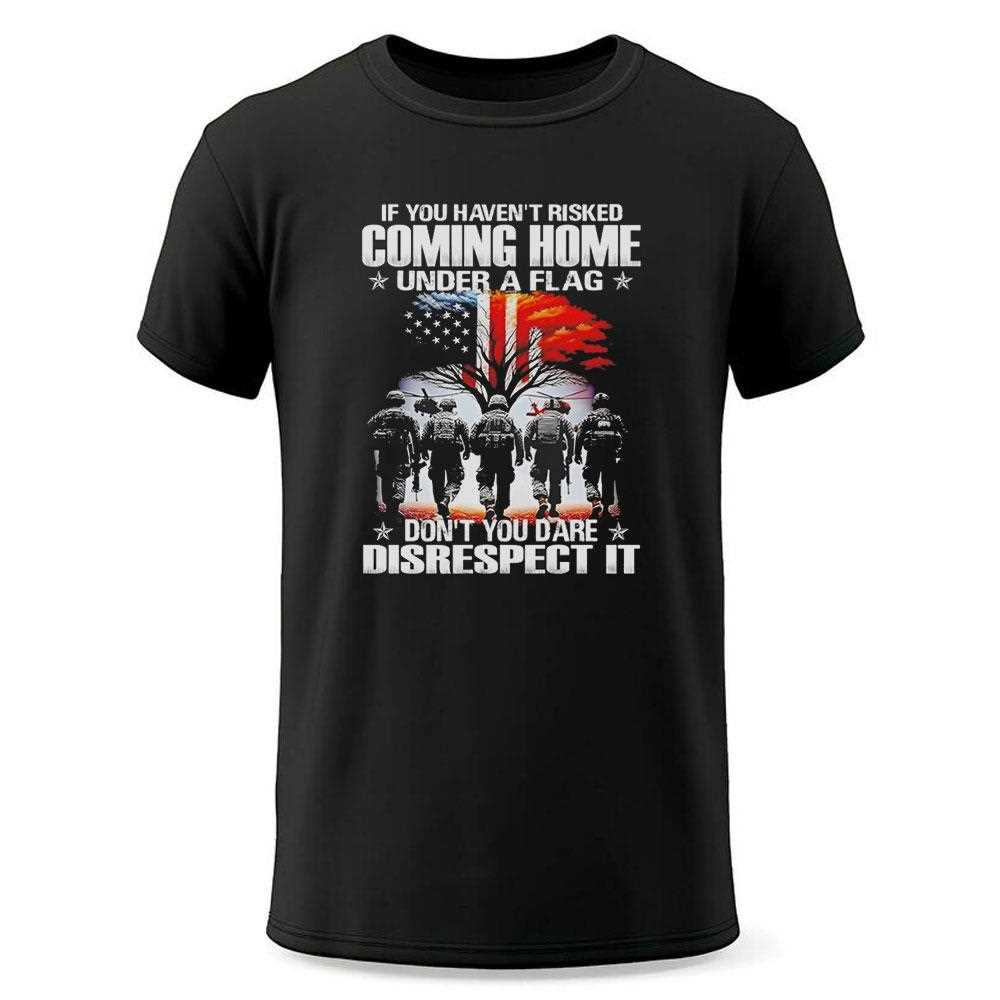 Make a profound and patriotic statement with this powerful veteran-tribute tee. The design features a striking, high-contrast graphic of a folded American flag alongside a hard-hitting, respectful message: “If You Havent Risked Coming Home Under A Flag Dont You Dare Disrespect It.” The artwork utilizes a weathered, vintage aesthetic and strong typography to convey a sense of sacrifice and honor. This shirt is designed for active military, veterans, and those who deeply respect the service of our armed forces. Printed on a premium, heavy-weight black cotton base, it offers a structured fit and long-lasting durability for memorial events, rallies, or everyday wear. The high-definition screen print is designed to be as resilient as the spirit it honors. Wear your pride and your values on your chest with a garment that demands respect and gratitude for the ultimate sacrifice. Honor the brave and make your stance clear—order your If You Havent Risked Coming Home Under A Flag Dont You Dare Disrespect It Tee today!. T-shirt !