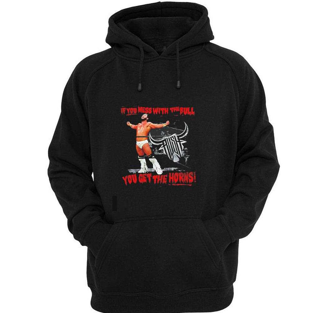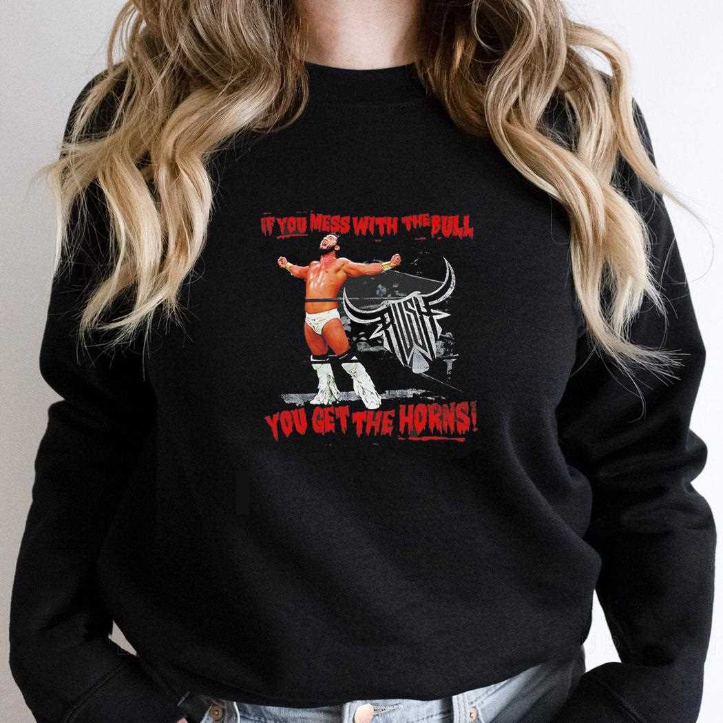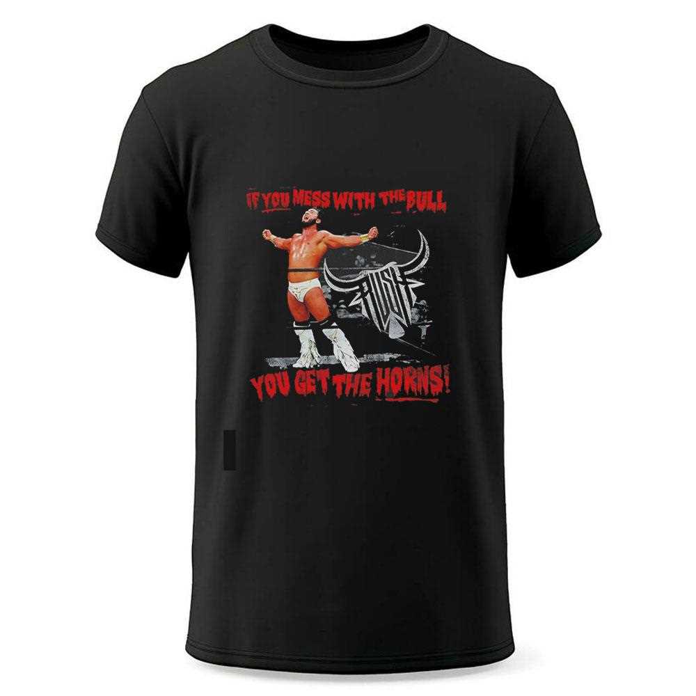 Layeth the smackdown on your boring wardrobe! This epic t-shirt features a powerful wrestler with the classic, tough-guy warning, “IF YOU MESS WITH THE BULL, YOU GET THE HORNS!” It’s an iconic statement of dominance for any fan of professional wrestling. Do you smell what this shirt is cookin’? It’s pure awesomeness. A must-have for any fan who knows their role. Get yours and bring it!.