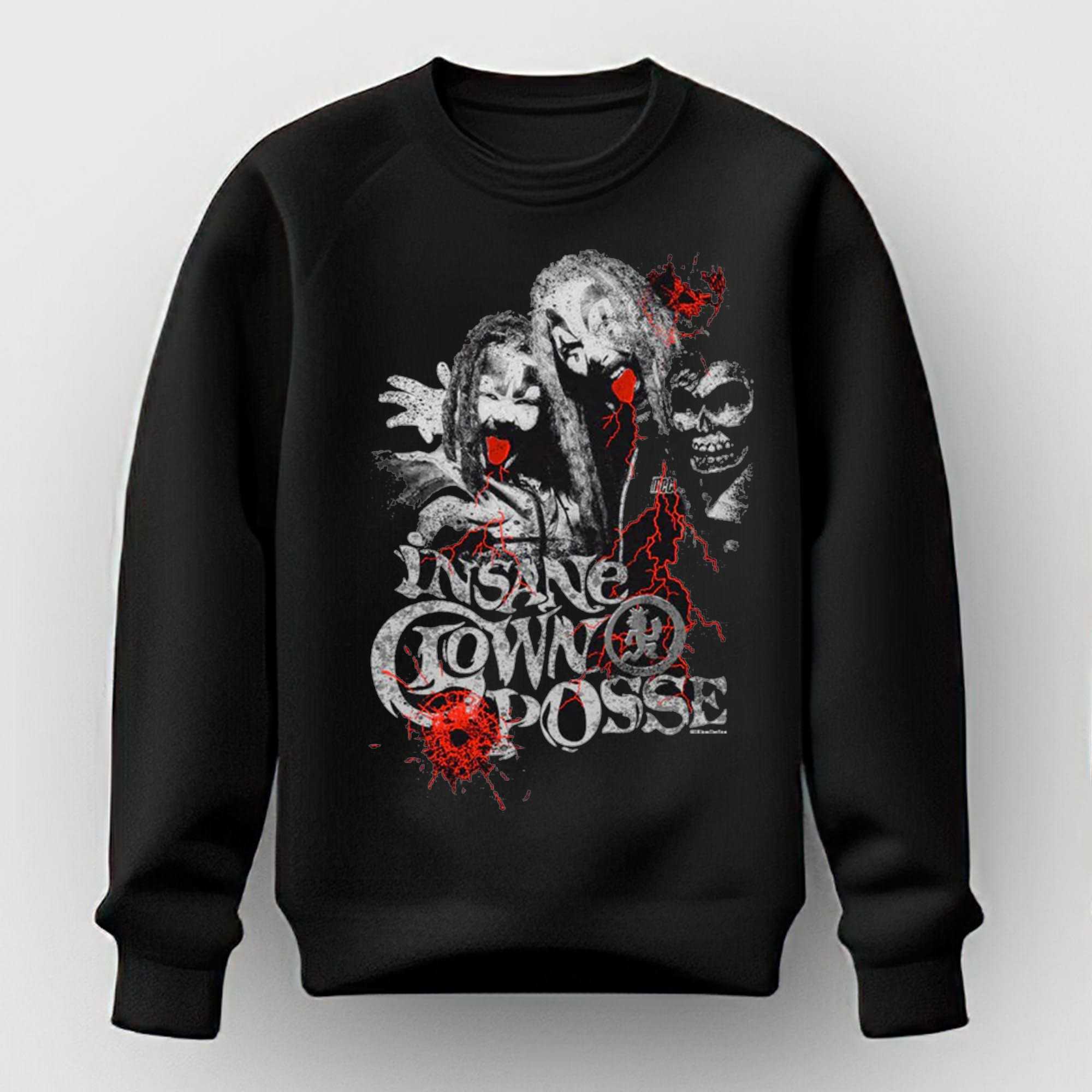Unleash your inner Juggalo with the **INSANE CLOWN POSE Dreadlock T-Shirt**, a design that screams raw energy and defiant spirit! This striking graphic features two grotesque, dreadlocked figures in black-and-white clown makeup, mouths agape with bright red tongues, electrifying red lightning bolts crackling around them. Ghostly, skull-like apparitions lurk in the background, adding to the macabre aesthetic. Below, the iconic ‘INSANE CLOWN POSSE’ text is rendered in a gritty, distressed gray font, interwoven with more vibrant red lightning and a menacing hatchet man logo. A visceral red splat at the bottom completes this unapologetically bold statement piece, perfectly capturing the intense, horrorcore essence of the legendary duo. It’s more than just a shirt; it’s a badge of honor for the dedicated and the fearless.