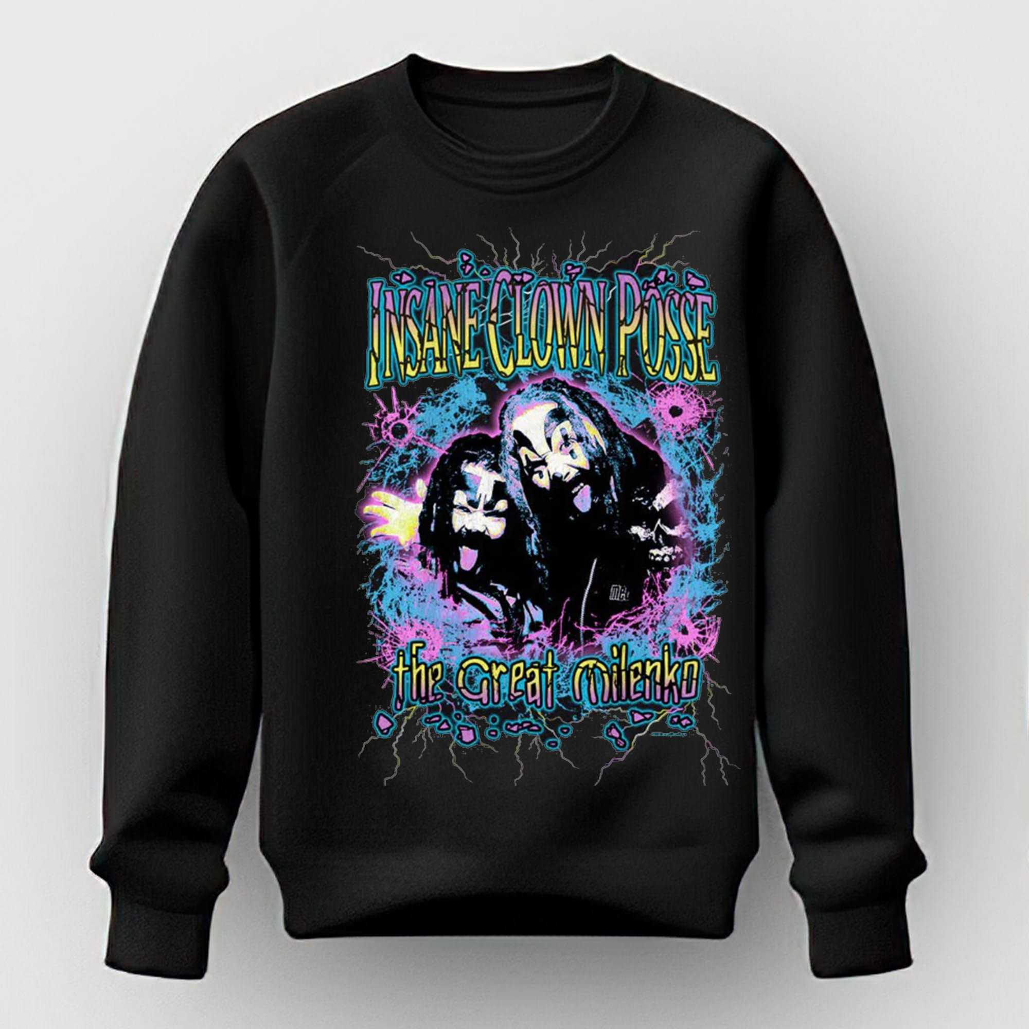 Don’t just limit your fandom; this electrifying design is available across a full range of apparel, including T-shirts, Hoodies, Long Sleeves, Sweatshirts, Tank Tops, and V-Necks, ensuring there’s a perfect fit for every Juggalo. Whether you’re a long-time devoted fan or discovering the greatness for the first time, the INSANE CLOWN POSE Milenko T-Shirt is an essential piece of your collection. Embrace the wicked clown energy and show your loyalty in ultimate style. Add to Cart now and join the family!
