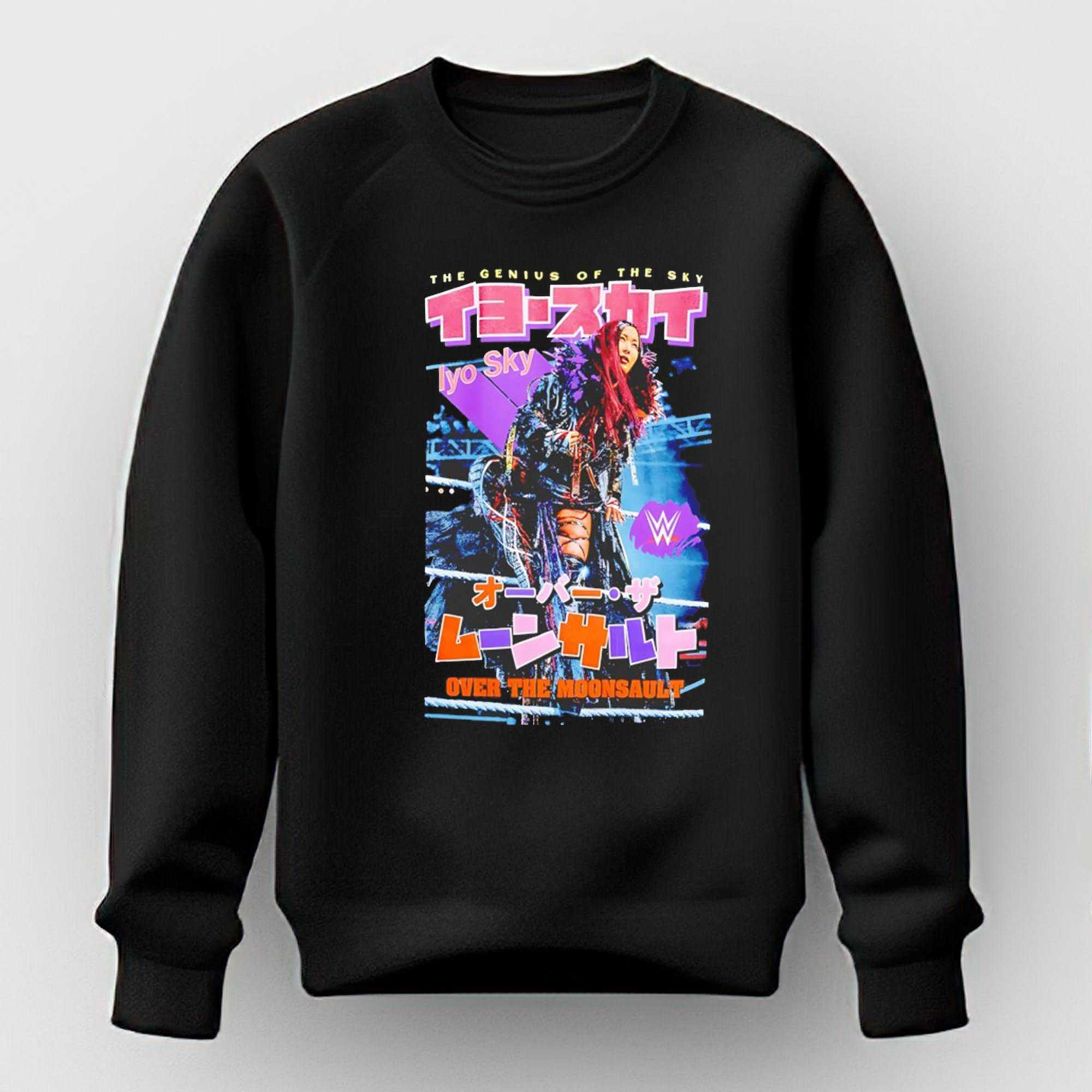 Step into the high-octane world of professional wrestling with a garment that celebrates pure athletic dominance. The Iyo Sky The Genius Of The Sky Over The Moon Sault Tee is a masterclass in urban-rock aesthetic, specifically designed for fans who appreciate the gravity-defying skills of the “Genius of the Sky.” The design features a stunning, multi-layered graphic that captures Iyo Sky in her signature high-flying element, surrounded by a cosmic background and Japanese-inspired typography. The vibrant purples, pinks, and neon highlights pop with professional intensity against the deep black canvas, mirroring the electric atmosphere of a sold-out arena during a main event.