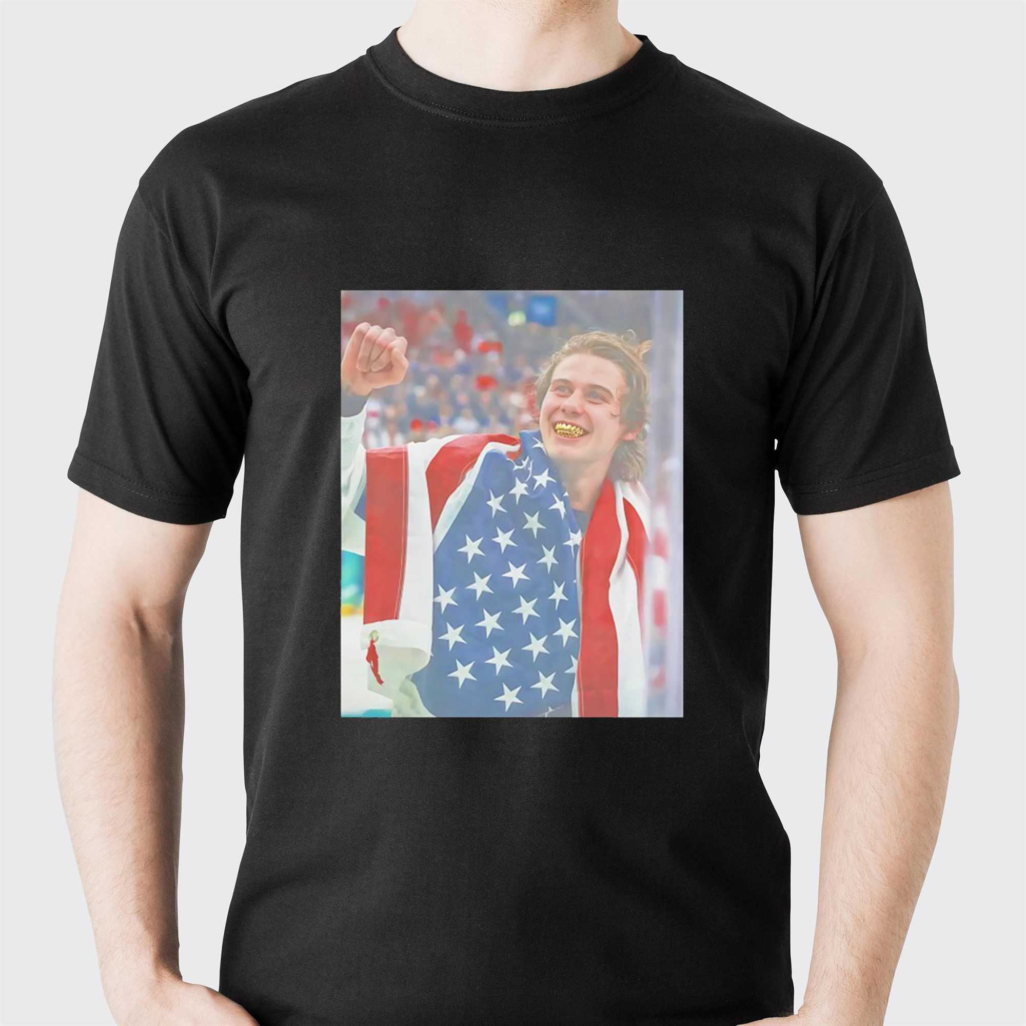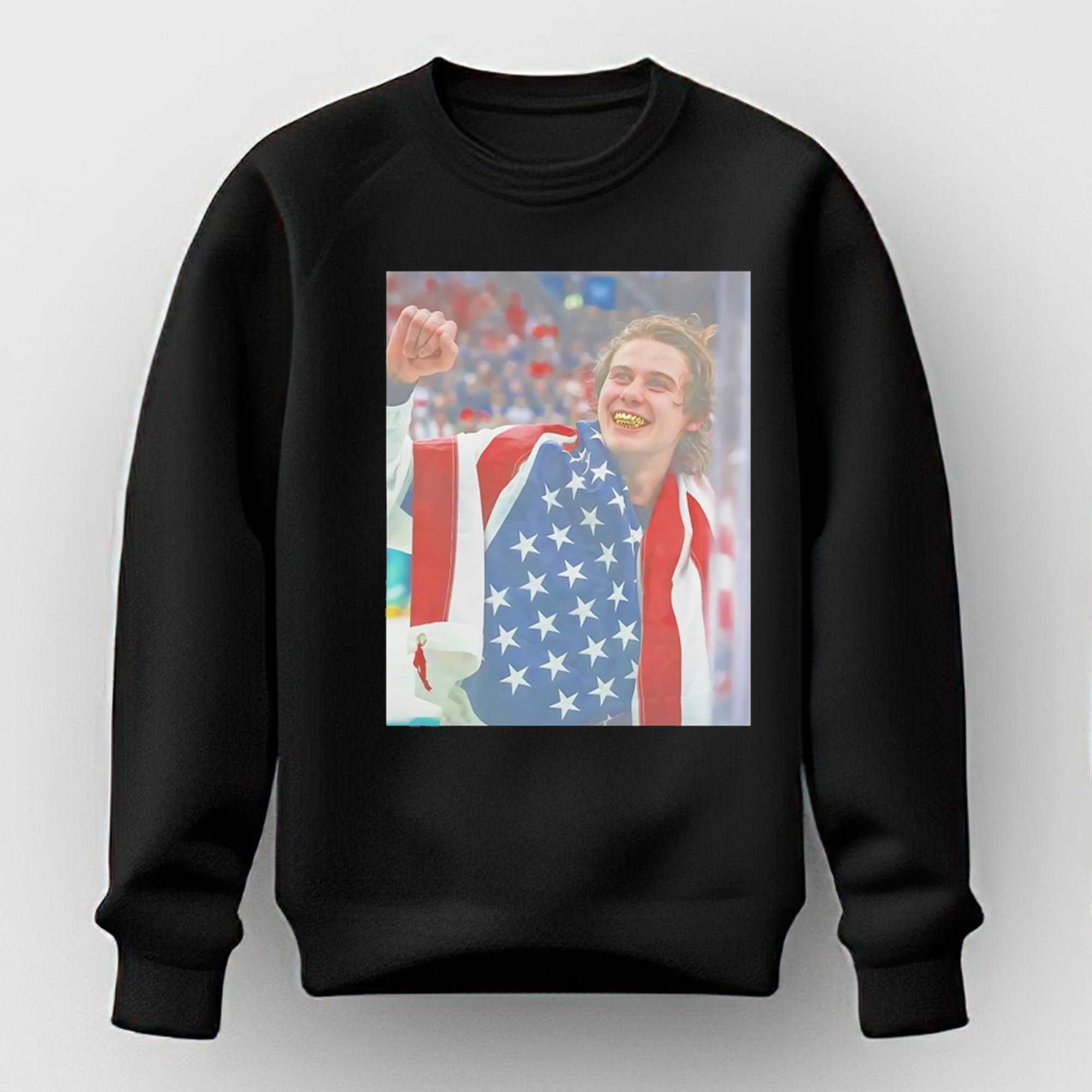 Celebrate the charismatic smile and the championship ambition of hockey’s brightest star with the Jack Hughes Golden Teeth Tee. This creative design takes the classic “hockey smile” and gives it a prestigious twist, symbolizing the ultimate goal of winning international gold. The graphic features a minimalist yet high-impact illustration of Jack Hughes, highlighting his trademark grit and the infectious energy he brings to the ice. Set on a deep navy background, the golden accents pop with professional intensity, making it a perfect piece for fans who appreciate a touch of style with their sports apparel.