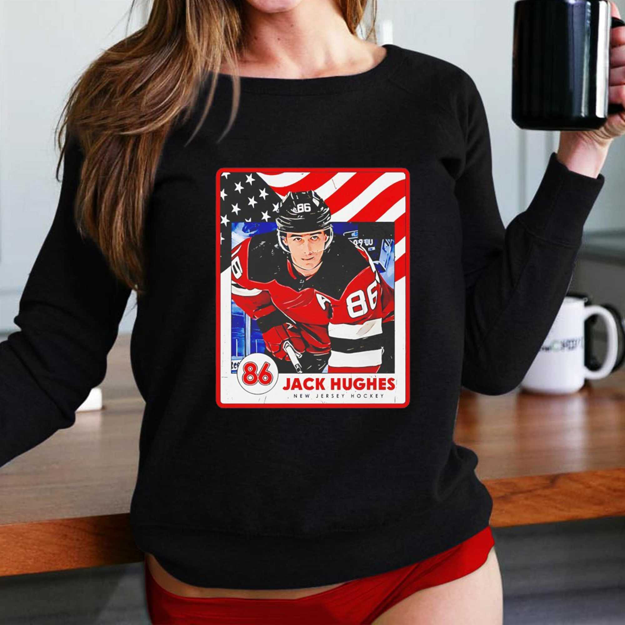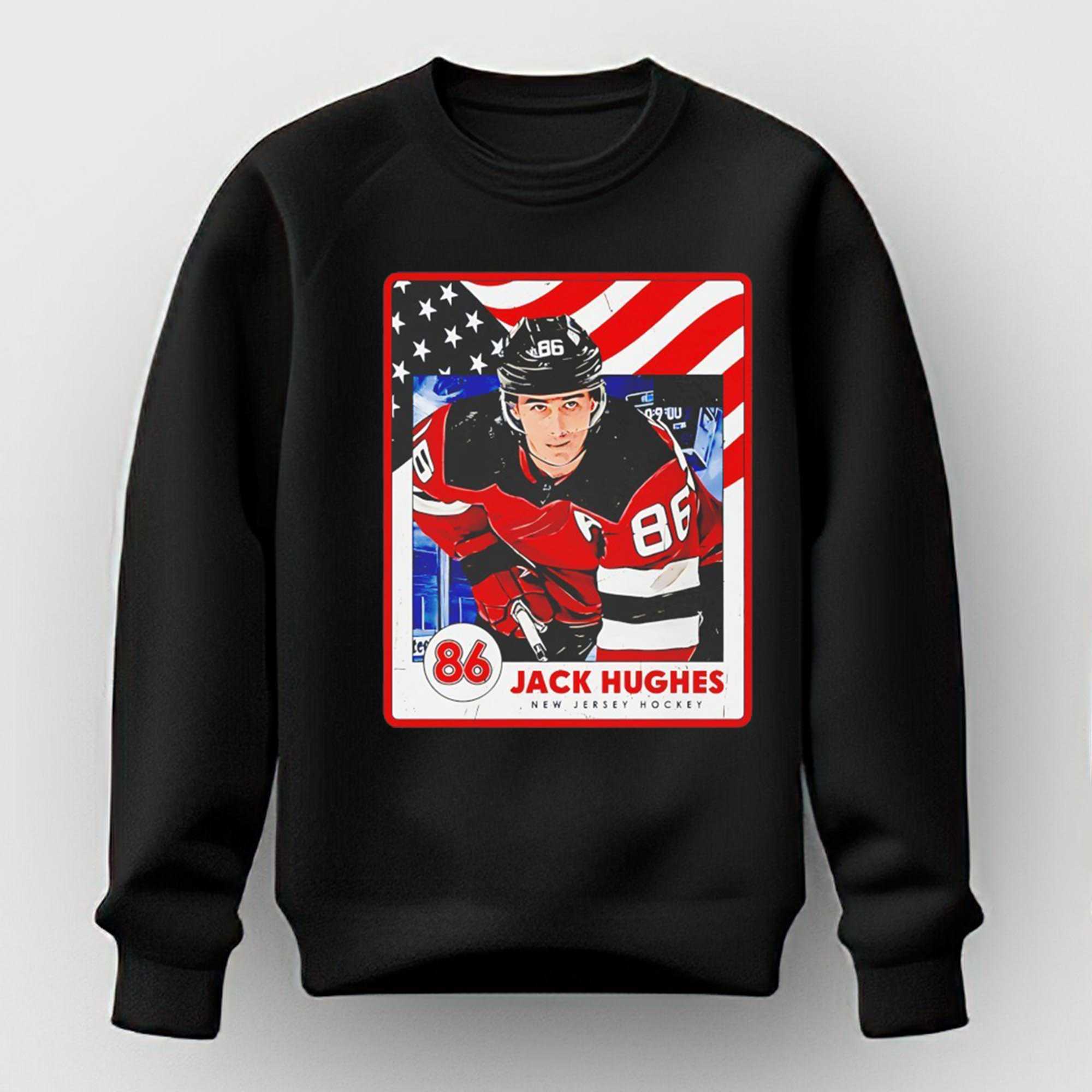 Step into the collection of a true aficionado and honor a generational talent with the Jack Hughes New Jersey Usa Card Tee. This design is a masterclass in “sports card” aesthetic, featuring a stunning, high-definition action graphic of Jack in a stylized trading card layout. The artwork captures the focus, the skill, and the uncompromising leadership that he brings to both the Devils and the national program. Utilizing a patriotic palette of red, white, and navy, the design provides a look that is both nostalgic and powerfully contemporary on the deep black background. It is an absolute must-have for collectors of elite-level sports memorabilia and fans of world-class skill.