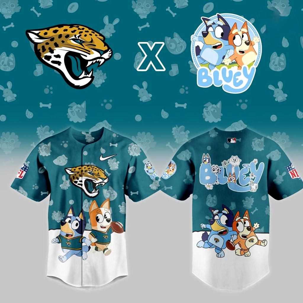 Unleash unparalleled team spirit and family fun with the Jacksonville Jaguars Bluey Night Baseball Jersey! This witty design masterfully merges the beloved Bluey universe with Jaguars fandom. The jersey features a striking teal upper half, patterned with subtle Bluey characters, bones, and paw prints, meeting a crisp white lower section. The front proudly displays the Jaguars’ growling logo and Nike swoosh, above Bluey and Bingo, playfully sporting mini Jaguars jerseys, with Bingo clutching a football. The back charmingly spells out “Bluey” in a playful font, while the whole Heeler family – Bluey, Bingo, Bandit, and Chilli – walk across the white stripe, all set against the matching teal pattern. It’s a delightful and humorous fusion, celebrating your favorite team and animated family in one unforgettable statement piece.