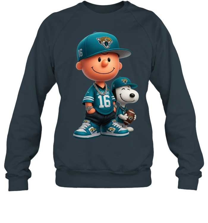 Unleash your inner Jaguar with a touch of classic charm in our “Jacksonville Jaguars Charlie Brown and Snoopy Peanuts Crewneck Sweatshirt.” This comfortable dark gray crewneck features Charlie Brown, ready for action with his football, and Snoopy, exuding his usual cool, both sporting subtle Jaguars-inspired details. The design expertly merges the beloved Peanuts characters with the fierce spirit of the Jacksonville Jaguars, creating a unique and heartwarming tribute. Crafted from soft, durable fabric, this sweatshirt provides ultimate comfort for game days or casual wear. It’s a playful and spirited way to demonstrate your loyalty to the Jaguars while enjoying the timeless appeal of Charlie Brown and Snoopy. Duuuval! Combine your love for Peanuts and the Jaguars. Secure your Jacksonville Jaguars Charlie Brown and Snoopy Peanuts Crewneck Sweatshirt and showcase your team spirit!. T-shirt !