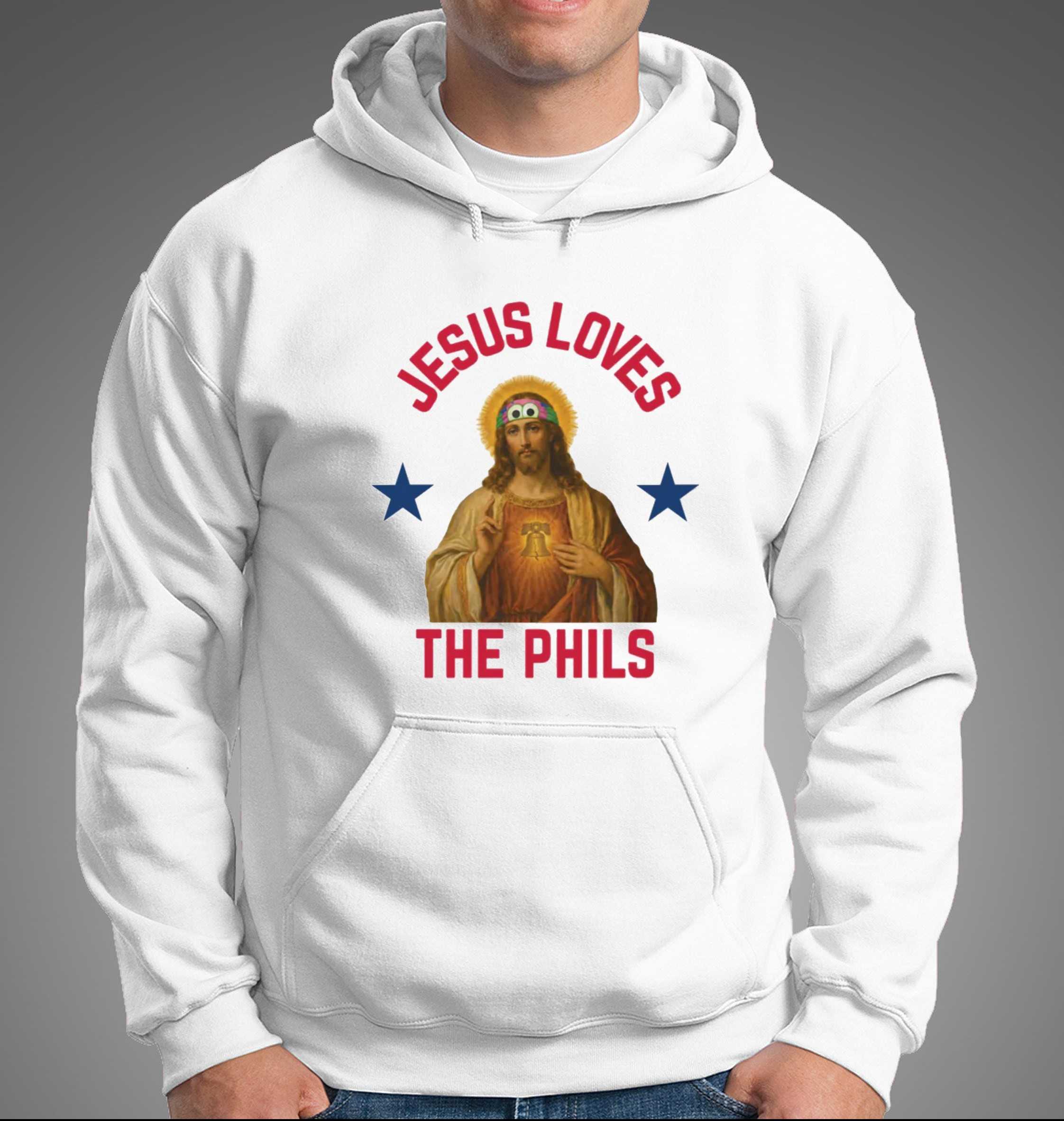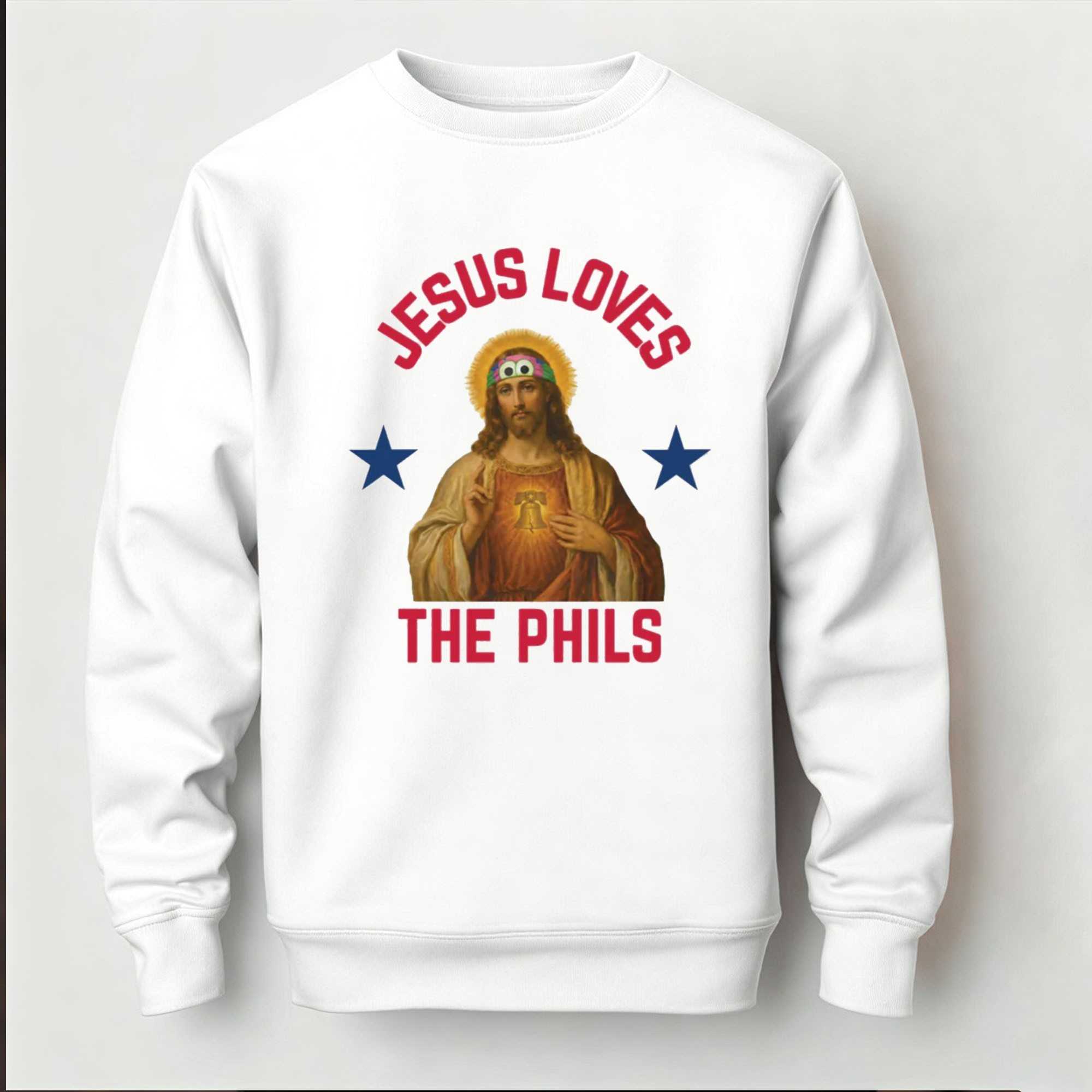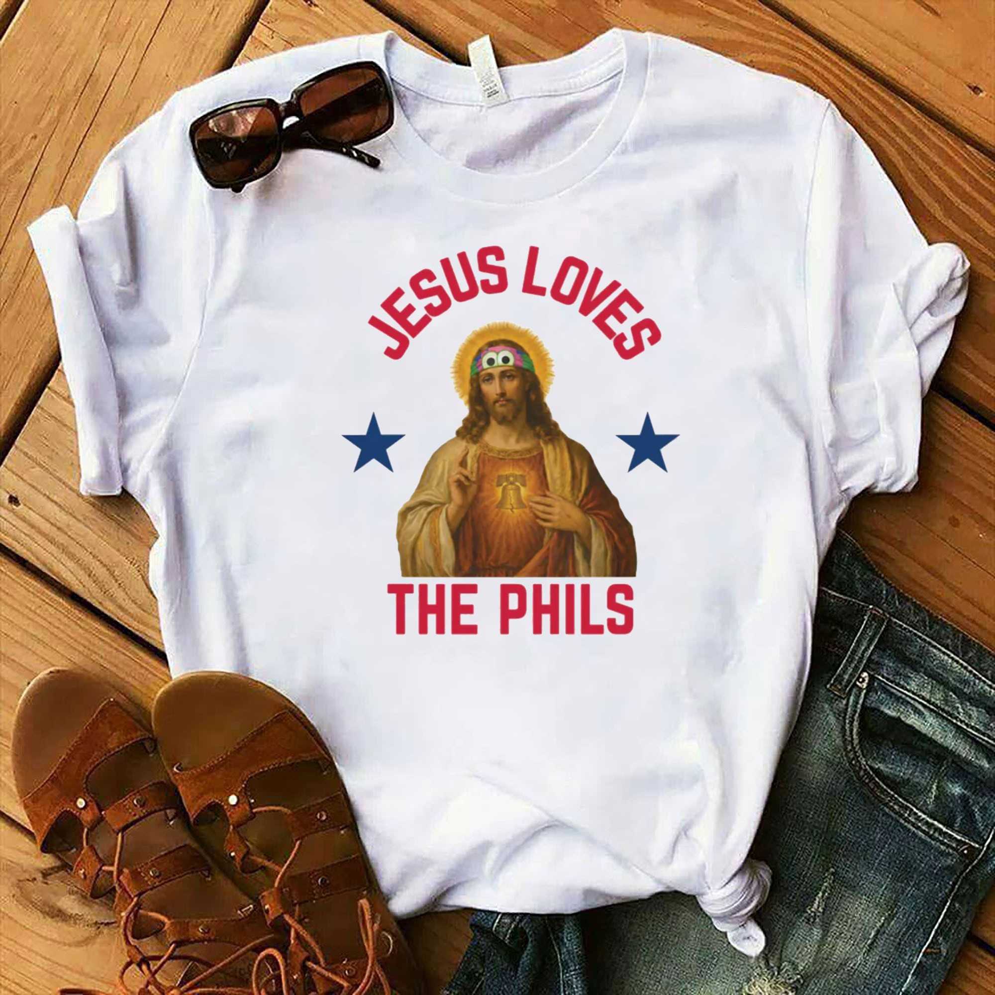 Get ready to declare your divine devotion to Philly baseball with the “Jesus Loves The Phils Philadelphia Phillies Heart Bell Shirt”! This hilariously irreverent design features a classic image of Jesus, complete with halo and flowing robes, but with a playful twist: he’s sporting a vibrant, multi-colored headband adorned with silly googly eyes. Centered on his chest is a radiant Liberty Bell, ingeniously incorporating a heart, symbolizing the deep love for Philadelphia. Above, the words ‘JESUS LOVES’ curve in bold red, mirroring ‘THE PHILS’ in matching red text below, all flanked by two patriotic dark blue stars. It’s a witty blend of faith and fandom, perfect for showing that even higher powers root for the Phillies.