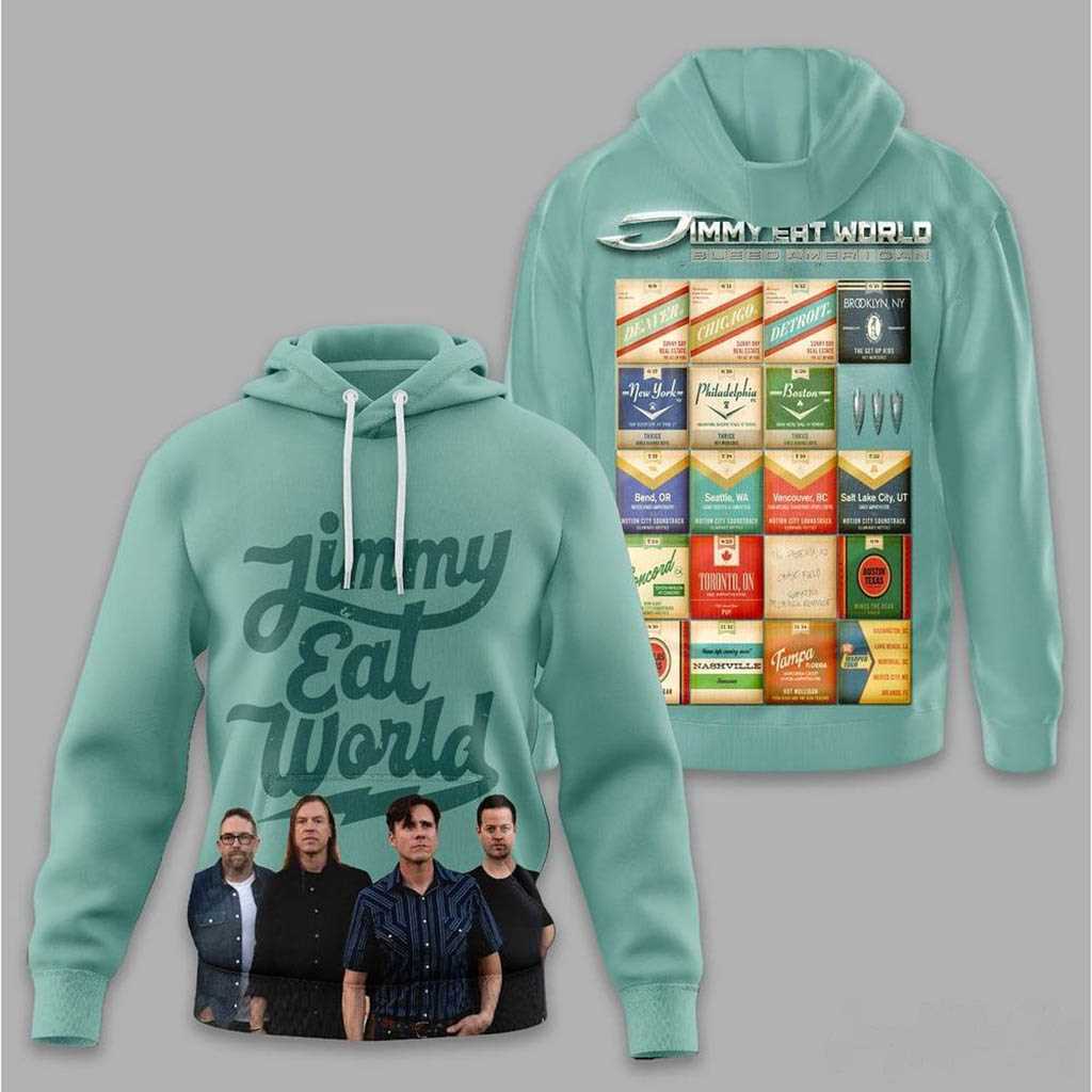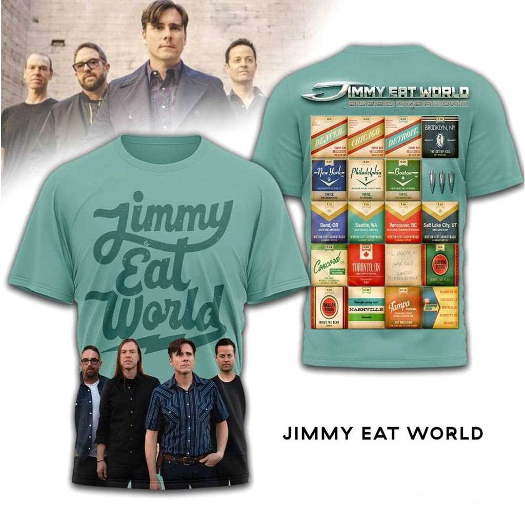 The Jimmy Eat World Bleed American 2026 T-Shirt isn’t just apparel; it’s a nostalgic trip wrapped in a vibrant, artistic package. This captivating tee features the iconic “Jimmy Eat World” script in a bold, dark teal on a refreshing mint green background, with the band members themselves casually posed across the front hem. The real showstopper is the back, where a clever grid of vintage-inspired “cigarette packs” adorns the fabric, each box a unique color block representing a city like Denver, Chicago, or New York, playfully hinting at tour stops or song inspirations, complete with subtle textual nods to other bands or album tracks like “The Middle.” This design offers a witty, visual journey through their musical legacy, making it a conversation starter for any die-hard fan.