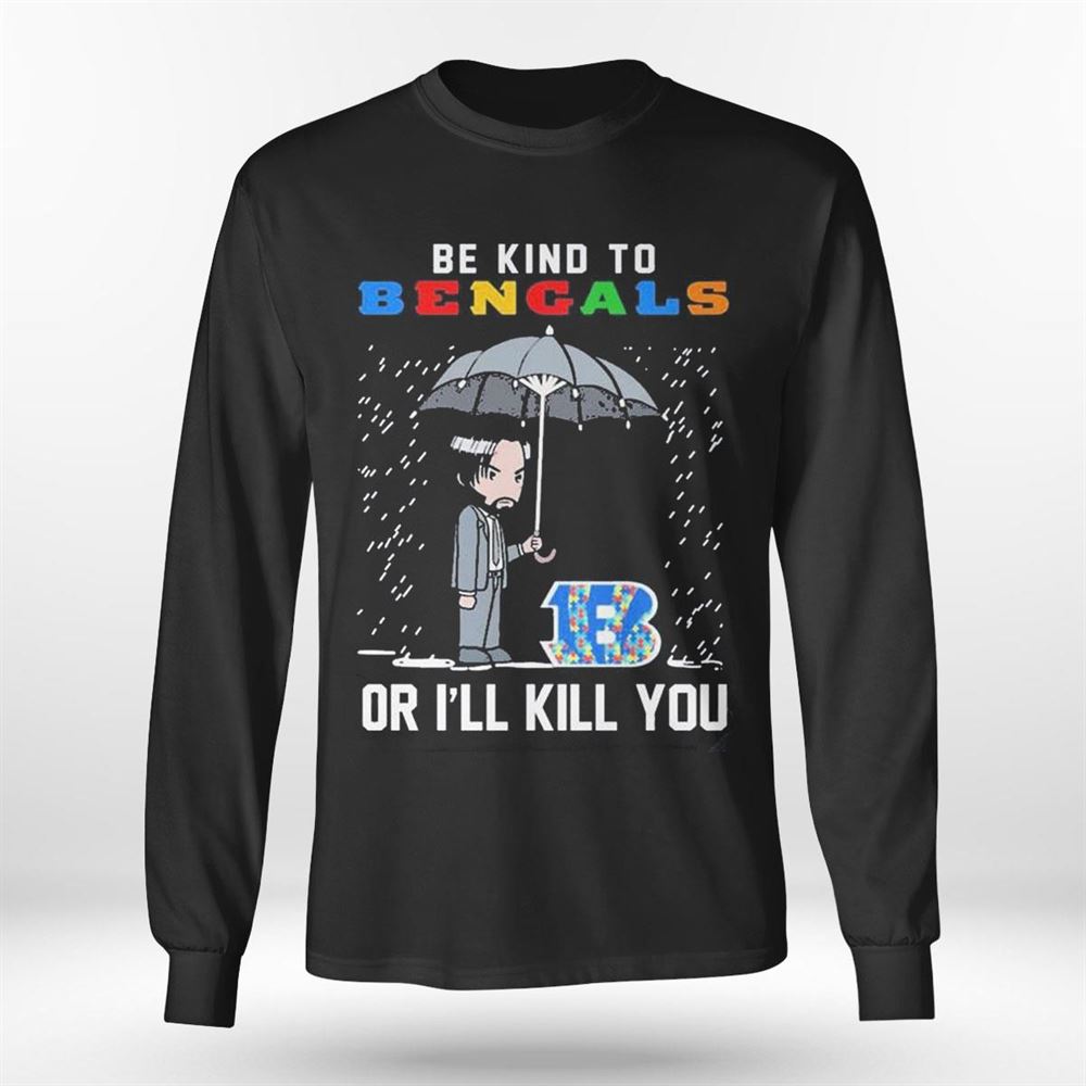 If you’re searching for a John Wick Be Kind Autism Cincinnati Bengals Or Ill Kill You T-shirt that can offer both a soft feel and breathability to keep you comfortable on sweltering summer days, look no further. . Our 100% cotton T-shirt is the answer to your wardrobe woes. Made from soft, breathable cotton, it will keep you comfortable and chic throughout the season. Not only is it easy to wear, but it’s also easy to care for – simply toss it in the washing machine and dry it on low heat, and it will look brand new. It’s also an excellent option for those with sensitive skin, thanks to its natural hypoallergenic properties. You don’t have to take our word for it – give it a try and see for yourself! Purchase your cotton T-shirt today and add a touch of comfort and style to your casual or dressed-up looks. Don’t wait any longer, add it to your cart and experience the benefits of our 100% cotton T-shirt !