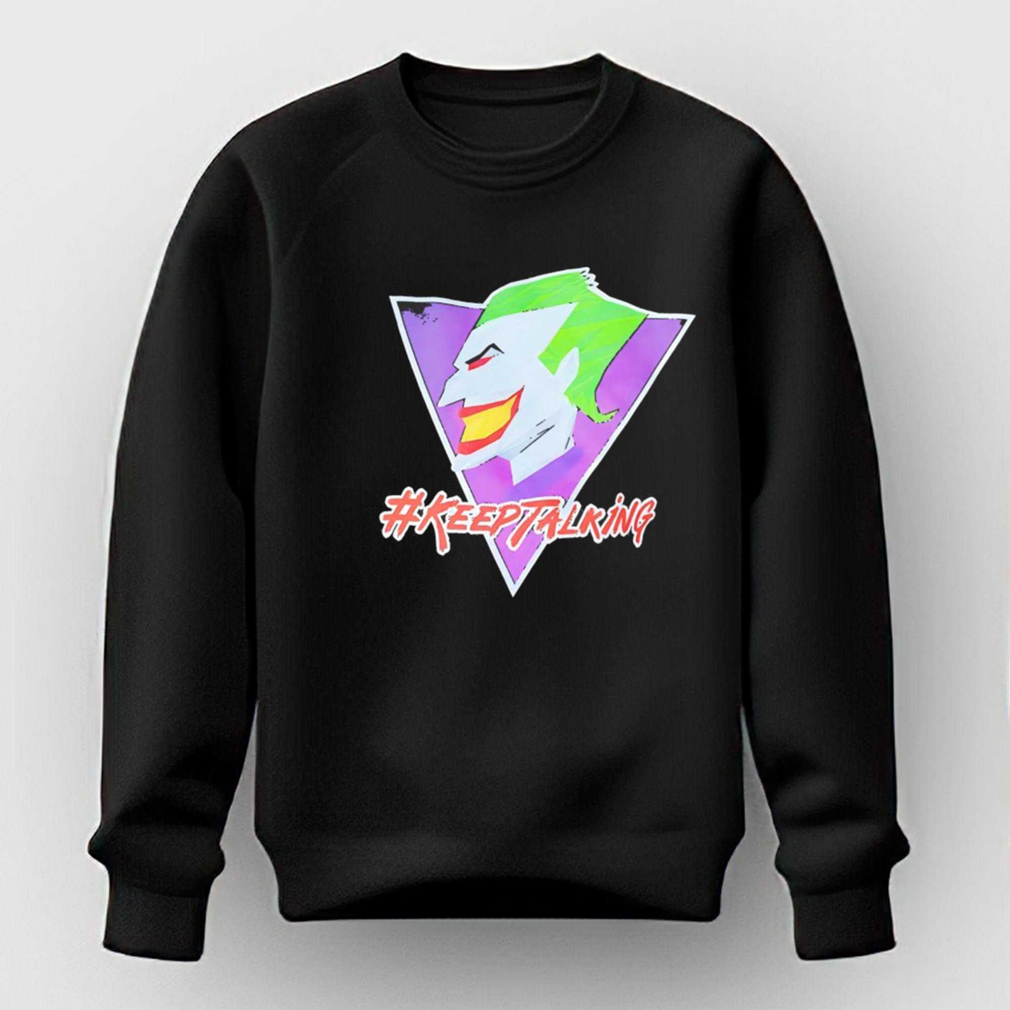 Get ready to make a statement with the “Joker Keep Talking Tee”! This design perfectly captures the iconic villain’s essence with a striking, stylized depiction of the Joker’s pale white face, vibrant green hair, menacing red eyes, and his signature wide yellow smile framed by bold red lips. His head is dynamically placed within a distressed inverted purple triangle, giving off an edgy, retro vibe with its slightly grunge outline. Below this potent symbol, the phrase “#KEEPTALKING” explodes in a vibrant red, brush-stroke style font with a sharp white outline. This darkly humorous graphic is a wry commentary on endless chatter, embodying the Joker’s chaotic charm and his uncanny ability to provoke and dismiss, making it the ultimate wear for those who find amusement in the absurd.