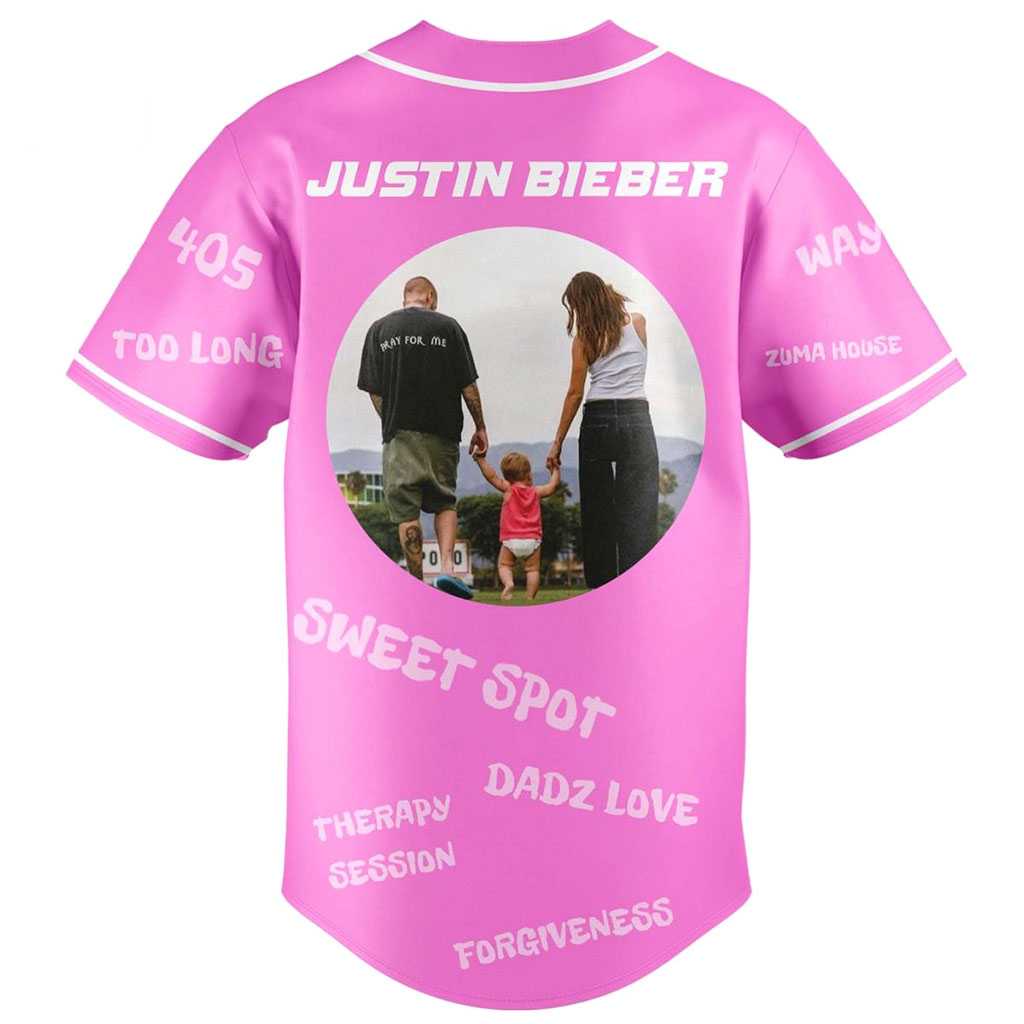 Step into the future of festival fashion with the Justin Bieber Coachella 2026 Desert Vibes Pink Baseball Jersey. This eye-catching pink jersey offers a witty and detailed visual narrative. The front spotlights “COACHELLA” in sparkling white, surrounded by playful text like “SWAG,” “ALL I CAN TAKE,” and a circular arrangement of six distinct male celebrity faces, hinting at a dream lineup alongside phrases like “YUKON” and “DAISIES.” The back boldly declares “JUSTIN BIEBER” across the shoulders, centered by a heartwarming circular image of a man, woman, and child holding hands, seemingly a family portrait. This personal touch is surrounded by humorous and reflective phrases such as “SWEET SPOT,” “DADZ LOVE,” and “FORGIVENESS,” creating a unique blend of pop culture and personal journey on a vibrant pink canvas.